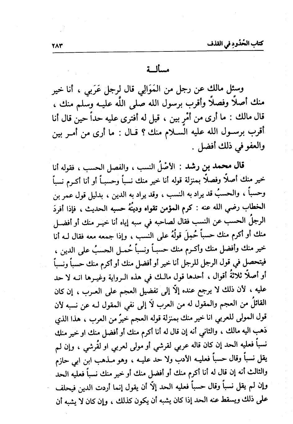 مسألة وسئل مالك عن رجل من الموالي قال لرجل عربي، أنا خير منك أصلا وفصلا وأقرب برسول الله - صَلَّى اللَّهُ عَلَيْهِ وَسَلَّمَ - منك، قال مالك: ما أرى من أمر بين، قيل له: أفترى عليه حدا حين قال: أنا أقرب برسول الله - عَلَيْهِ السَّلَامُ - منك؟ قال: ما أرى من أمر بين والعفو في ذلك أفضل.