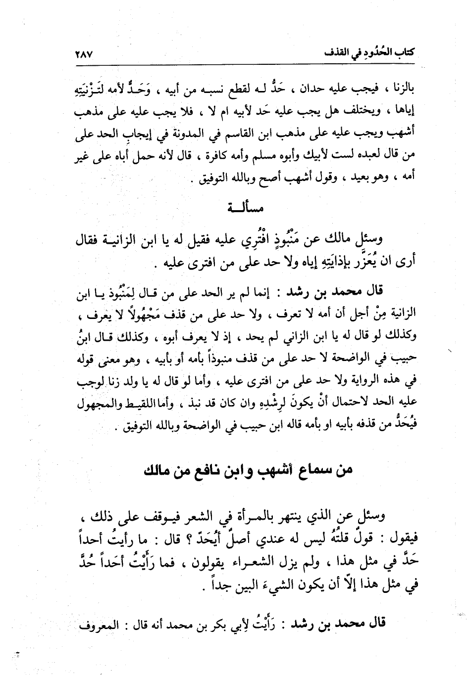 من سماع أشهب وابن نافع من مالك وسئل عن الذي ينتهر بالمرأة في الشعر فيوقف على ذلك، فيقول: قول قلته ليس له عندي أصل أيحد؟ قال: ما رأيت أحدا حد في مثل هذا، ولم يزل الشعراء يقولون، فما رأيت أحدا حد في مثل هذا إلا أن يكون الشيء البين جدا.