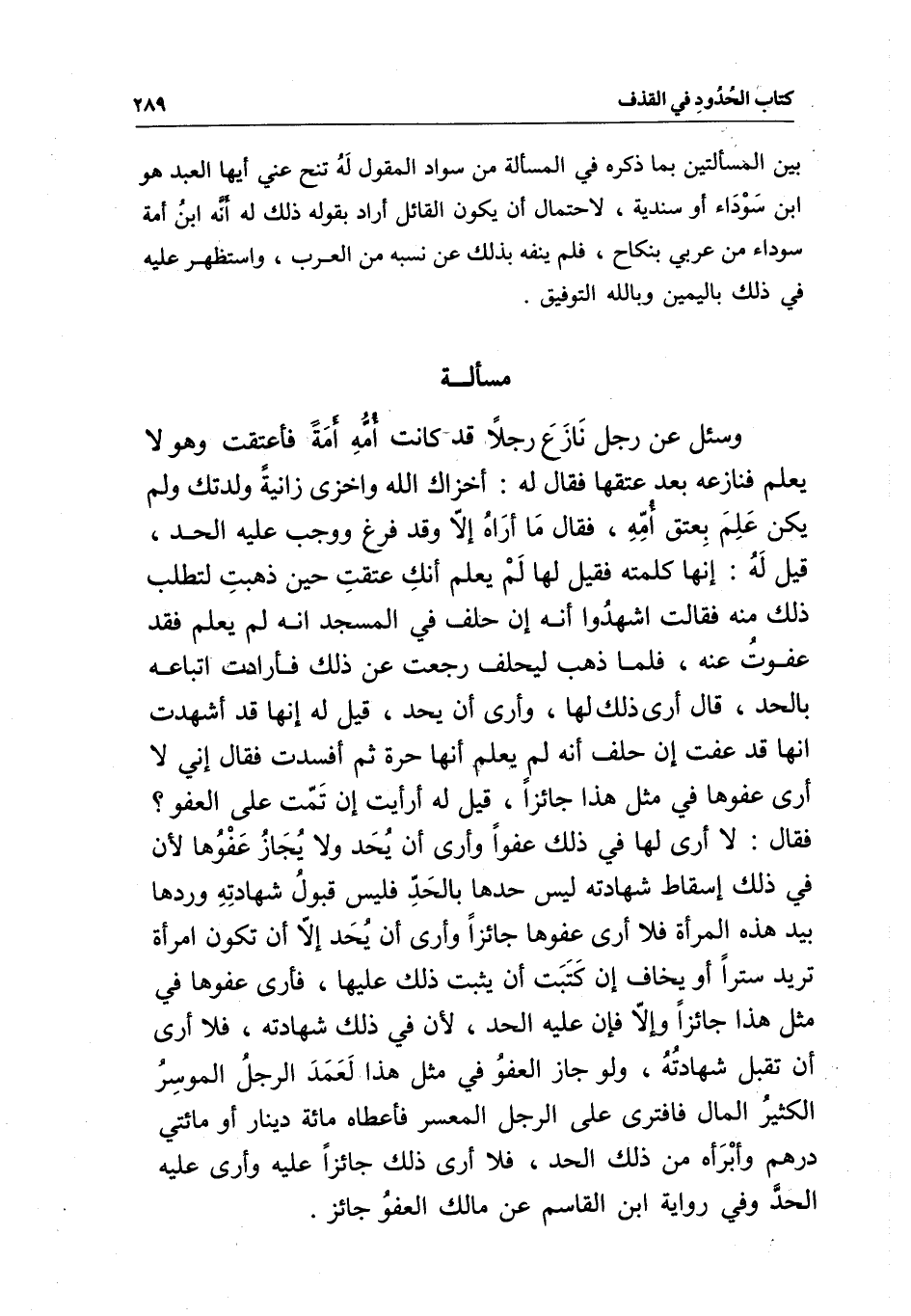 مسألة وسئل عن رجل نازع رجلا قد كانت أمه أمة فأعتقت وهو لا يعلم فنازعه بعد عتقها فقال له: أخزاك الله وأخزى زانية ولدتك، ولم يكن علم بعتق أمه، فقال: ما أراه إلا وقد فرغ ووجب عليه الحد، قيل له: إنها كلمته، فقيل لها: لم يعلم أنك عتقت حين ذهبت. لتطلب ذلك منه، فقالت: اشهدوا أنه إن حلف في المسجد أنه لم يعلم فقد عفوت عنه، فلما ذهب ليحلف رجعت عن ذلك فأرادت إتباعه بالحد، قال أرى ذلك لها، وأرى أن يحد، قيل له: إنها قد أشهدت أنها قد عفت إن حلف أنه لم يعلم أنها حرة ثم أفسدت فقال: إني لا أرى عفوها في مثل هذا جائزا، قيل له: أرأيت إن تمت على العفو؟ فقال: لا أرى لها في ذلك عفوا وأرى أن يحد ولا يجاز عفوها لأن في ذلك إسقاط شهادته ليس حدها بالحد فليس قبول شهادته وردها بيد هذه المرأة، فلا أرى عفوها جائزا وأرى أن يحد إلا أن تكون امرأة تريد سترا أو يخاف إن كتبت أن يثبت ذلك عليها، فأرى عفوها في مثل هذا جائزا وإلا فإن عليه الحد؛ لأن في ذلك شهادته، فلا أرى أن تقبل شهادته، ولو جاز العفو في مثل هذا لعمد الرجل الموسر الكثير المال فافترى على الرجل المعسر فأعطاه مائة دينار أو مائتي درهم وأبرأه من ذلك الحد، فلا أرى ذلك جائزا عليه وأرى عليه الحد وفي رواية ابن القاسم عن مالك العفو جائز.