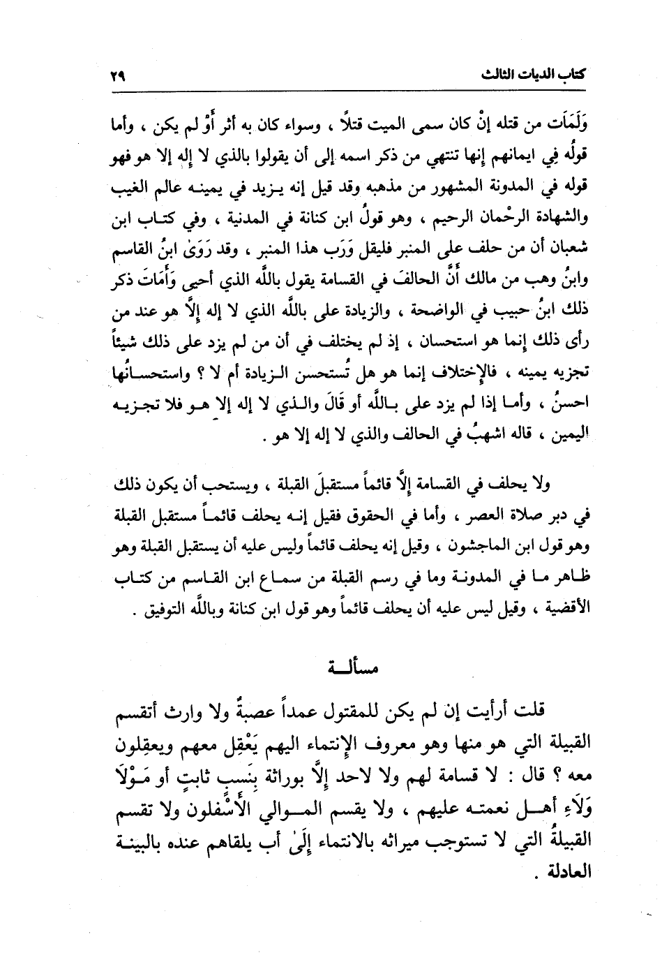 مسألة قلت: أرأيت إن لم يكن للمقتول عمدا عصبة ولا وارث أتقسم القبيلة التي هو منها وهو معروف الانتماء إليهم يعقل معهم ويعقلون معه؟ قال: لا قسامة لهم ولا لأحد إلا بوراثة بنسب ثابت أو مولى ولاء أهل نعمته عليهم، ولا يقسم الموالي الأسفلون ولا تقسم القبيلة التي لا تستوجب ميراثه بالانتماء إلى أب يلقاهم عنده بالبينة العادلة.