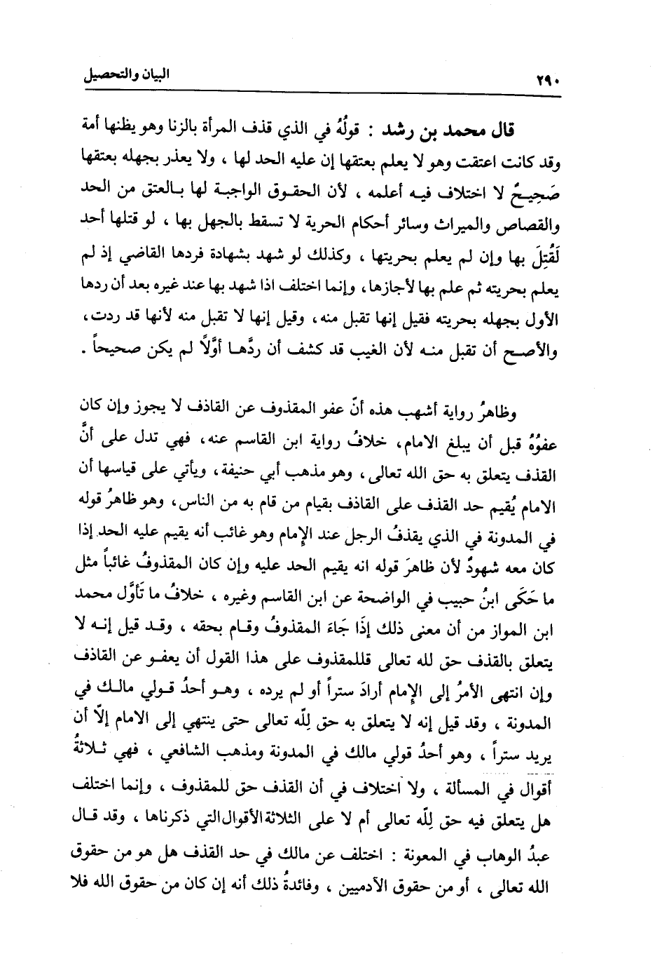 وظاهر رواية أشهب هذه أن عفو المقذوف عن القاذف لا يجوز وإن كان عفوه قبل أن يبلغ الإمام، خلاف رواية ابن القاسم عنه، فهي تدل على أن القذف يتعلق به حق الله تعالى، وهو مذهب أبي حنيفة، ويأتي على قياسها أن الإمام يقيم حد القذف على القاذف بقيام من قام به من الناس، وهو ظاهر قوله في المدونة في الذي يقذف الرجل عند الإمام وهو غائب أنه يقيم عليه الحد إذا كان معه شهود؛ لأن ظاهر قوله أنه يقيم الحد عليه وإن كان المقذوف غائبا، مثل ما حكى ابن حبيب في الواضحة عن ابن القاسم وغيره، خلاف ما تأول محمد بن المواز من أن معنى ذلك إذا جاء المقذوف وقام بحقه، وقد قيل: إنه لا يتعلق بالقذف حق لله تعالى فللمقذوف على هذا القول أن يعفو عن القاذف، وإن انتهى الأمر إلى الإمام أراد سترا أو لم يرده، وهو أحد قولي مالك في المدونة، وقد قيل: إنه لا يتعلق به حق لله تعالى حتى ينتهي إلى الإمام إلا أن يريد سترا، وهو أحد قولي مالك في المدونة ومذهب الشافعي، فهي ثلاثة أقوال في المسألة، ولا اختلاف في أن القذف حق للمقذوف، وإنما اختلف هل يتعلق فيه حق لله تعالى أم لا؟ على الثلاثة الأقوال التي ذكرناها، وقد قال عبد الوهاب في المعونة: اختلف عن مالك في حد القذف هل هو من حقوق الله تعالى، أو من حقوق الآدميين، وفائدة ذلك أنه إن كان من حقوق الله فلا