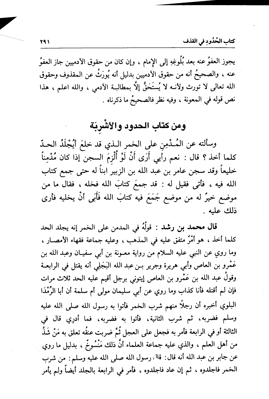 ومن كتاب الحدود والأشربة وسألته عن المدمن على الخمر الذي قد خلع أيجلد الحد كلما أخذ؟ قال: نعم رأيي أرى أن لو ألزم السجن إذا كان مدمنا خليعا، وقد سجن عامر بن عبد الله بن الزبير ابنا له حتى جمع كتاب الله فيه، فأتى فقيل له: قد جمع كتاب الله فخله، فقال ما من موضع خير له من موضع جمع فيه كتاب الله فأبى أن يخليه فأرى ذلك عليه.