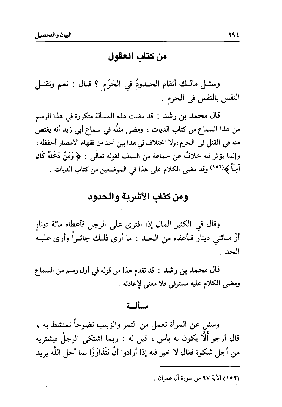 قال محمد بن رشد: قد مضت هذه المسألة متكررة في هذا الرسم من هذا إلى السماع من كتاب الديات، ومضى مثله في سماع أبي زيد أنه يقتص منه في القتل في الحرم، ولا اختلاف في هذا بين أحد من فقهاء الأمصار أحفظه، وإنما يؤثر فيه خلاف عن جماعة من السلف لِقَوْلِهِ تَعَالَى: {وَمَنْ دَخَلَهُ كَانَ آمِنًا} [آل عمران: 97] وقد مضى الكلام على هذا في الموضعين من كتاب الديات.
