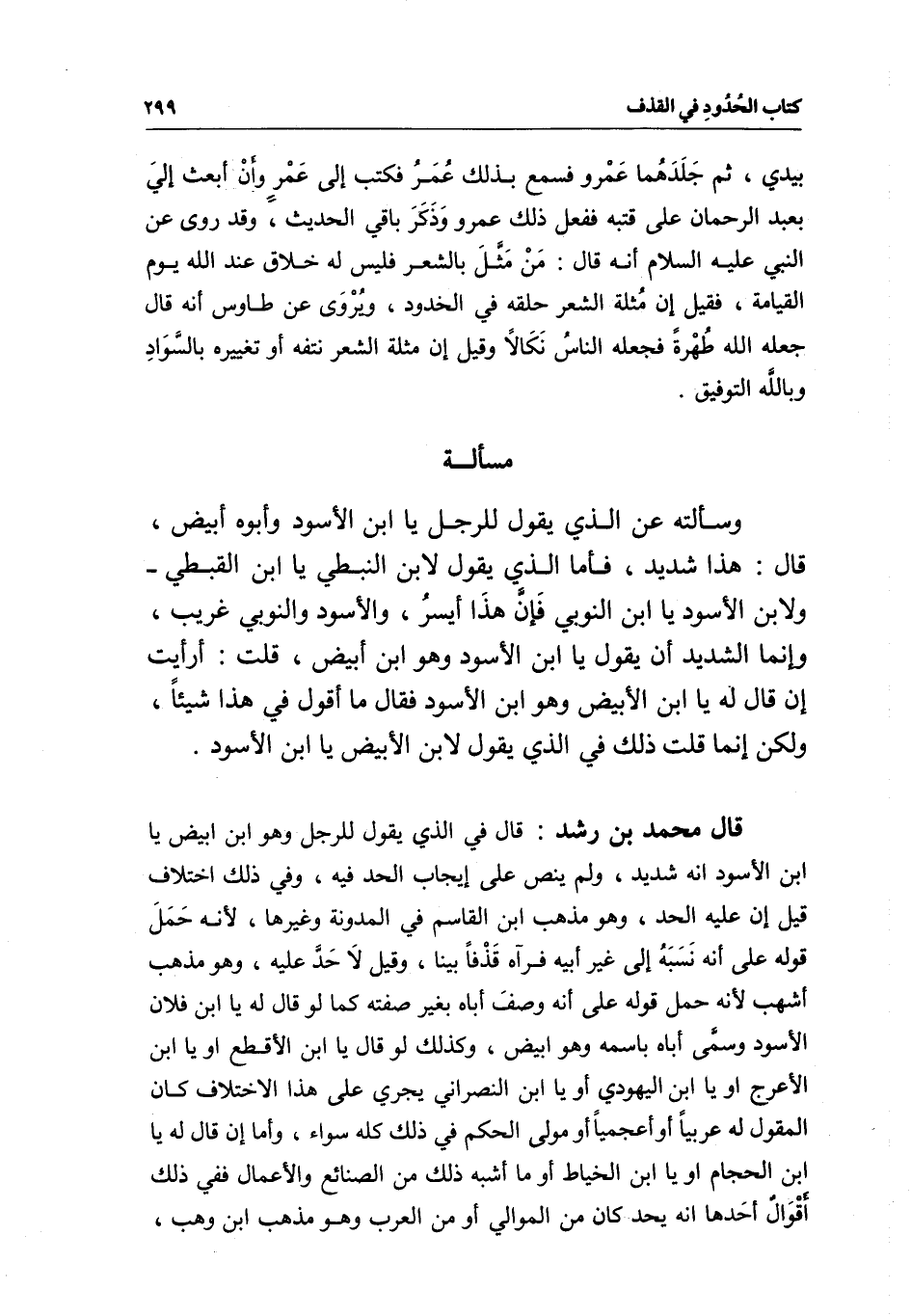 قال محمد بن رشد: قال في الذي يقول للرجل وهو ابن ابيض يا ابن الأسود إنه شديد، ولم ينص على إيجاب الحد فيه، وفي ذلك اختلاف، قيل إن عليه الحد، وهو مذهب ابن القاسم في المدونة وغيرها؛ لأنه حمل قوله على أنه نسبه إلى غير أبيه فرآه قذفا بينا، وقيل لا حد عليه، وهو مذهب أشهب لأنه حمل قوله على أنه وصف أباه بغير صفته كما لو قال له: يا ابن فلان الأسود، وسمى أباه باسمه وهو أبيض، وكذلك لو قال يا ابن الأقطع أو يا ابن الأعرج أو يا ابن اليهودي أو يا ابن النصراني يجري على هذا الاختلاف كان المقول له عربيا أو أعجميا أو مولى الحكم في ذلك كله سواء، وأما إن قال له: يا ابن الحجام أو يا ابن الخياط أو ما أشبه ذلك من الصنائع والأعمال، ففي ذلك أقوال أحدها: أنه يحد كان من الموالي أو من العرب وهو مذهب ابن وهب،