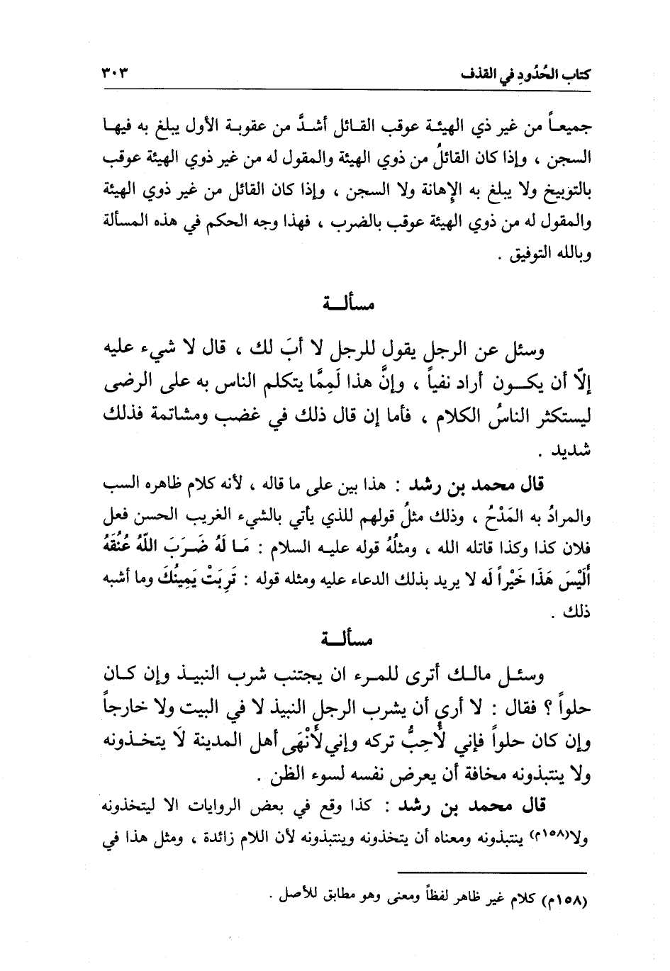 مسألة وسئل مالك: أترى للمرء أن يجتنب شرب النبيذ وإن كان حلوا؟ فقال: لا أرى أن يشرب الرجل النبيذ لا في البيت ولا خارجا وإن كان حلوا فإني لأحب تركه وإني لأنهى أهل المدينة لا يتخذونه ولا ينتبذونه مخافة أن يعرض نفسه لسوء الظن.