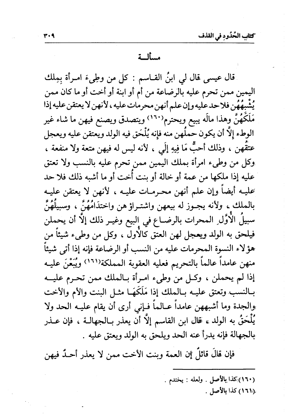 مسألة قال عيسى: قال لي ابن القاسم: كل من وطئ امرأة بملك اليمين ممن تحرم عليه بالرضاعة من أم أو ابنة أو أخت أو ما كان ممن يشبههن فلا حد عليه وإن علم أنهن محرمات عليه؛ لأنهن لا يعتقن عليه إذا ملكهن وهذا ماله يبيع ويحترم ويتصدق ويصنع فيهن ما شاء غير الوطء إلا أن يكون حملهن منه فإنه يلحق فيه الولد ويعتقن عليه ويعجل عتقهن، وذلك أحب ما فيه إلي؛ لأنه ليس له فيهن متعة ولا منفعة، وكل من وطئ امرأة بملك اليمين ممن تحرم عليه بالنسب ولا تعتق عليه إذا ملكها من عمة أو خالة أو بنت أخت أو ما أشبه ذلك فلا حد عليه أيضا وإن علم أنهن محرمات عليه؛ لأنهن لا يعتقن عليه بالملك، ولأنه يجوز له بيعهن واشتراؤهن واختدامهن، وسبيلهن سبيل الأول المحرمات بالرضاع في البيع وغير ذلك إلا أن يحملن فيلحق به الولد ويعجل لهن العتق كالأول، وكل من وطئ شيئا من هؤلاء النسوة المحرمات عليه من النسب أو الرضاعة فإنه إذا أتى شيئا منهن عامدا عالما بالتحريم فعليه العقوبة المملكة ويبعن عليه إذا لم يحملن، وكل من وطئ امرأة بالملك ممن تحرم عليه بالنسب وتعتق عليه بالملك إذا ملكها مثل البنت والأم والأخت والجدة وما أشبههن عامدا عالما فإني أرى أن يقام عليه الحد ولا يلحق به الولد، قال ابن القاسم: إلا أن يعذر بالجهالة، فإن عذر بالجهالة فإنه يدرأ عنه الحد ويلحق به الولد ويعتق عليه.