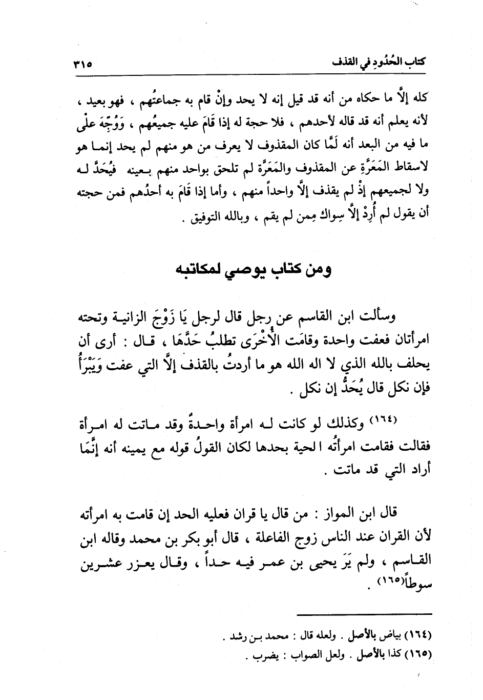 ومن كتاب يوصي لمكاتبه وسألت ابن القاسم عن رجل قال لرجل يا زوج الزانية وتحته امرأتان فعفت واحدة وقامت الأخرى تطلب حدها، قال: أرى أن يحلف بالله الذي لا إله إلا الله هو ما أردت بالقذف إلا التي عفت ويبرأ، فإن نكل قال: يحد إن نكل.