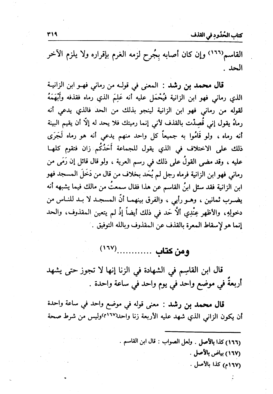 قال ابن القاسم في الشهادة في الزنا إنها لا تجوز حتى يشهد أربعة في موضع واحد في يوم واحد في ساعة واحدة.