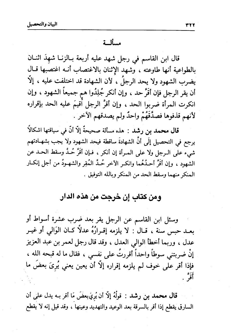 قال محمد بن رشد: هذه مسألة صحيحة إلا أن في سياقتها إشكالا يرجع في التحصيل إلى أن الشهادة ساقطة فيحد الشهود ولا يجب بشهادتهم شيء على الرجل ولا على المرأة إن أنكر، فإن أقر حد وسقط الحد عن الشهود، وإن أقر أحدهما وأنكر الآخر حد المقر والشهود من أجل إنكار المنكر منهما وسقط الحد من المنكر، وبالله التوفيق.