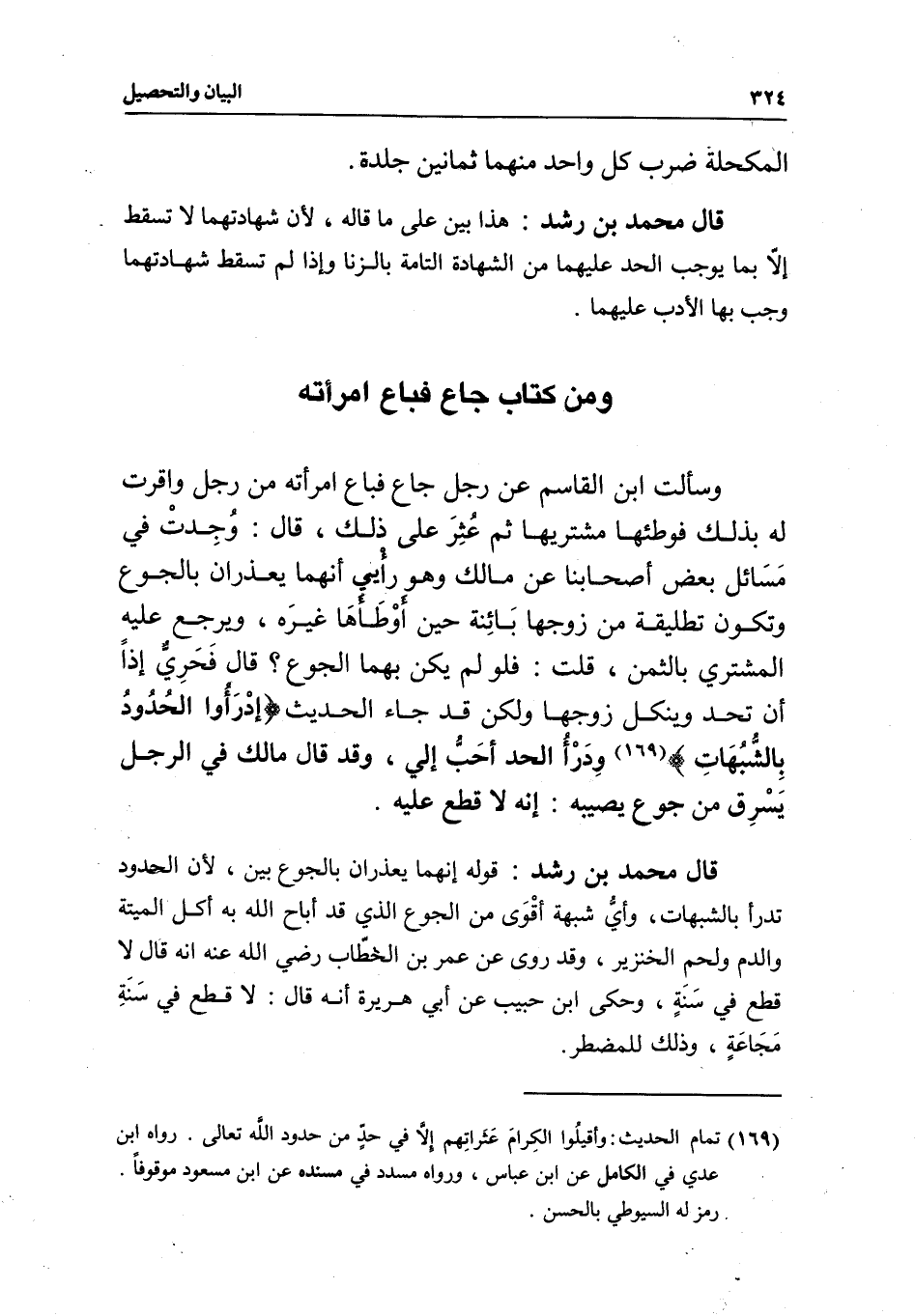 وسألت ابن القاسم عن رجل جاع فباع امرأته من رجل وأقرت له بذلك فوطئها مشتريها ثم عثر على ذلك، قال: وجدت في مسائل بعض أصحابنا عن مالك وهو رأيي أنهما يعذران بالجوع وتكون تطليقة من زوجها بائنة حين أوطأها غيره، ويرجع عليه المشتري بالثمن، قلت: فلو لم يكن بهما الجوع؟ قال فحري إذا أن تحد وينكل زوجها، ولكن قد جاء الحديث «ادرءوا الحدود بالشبهات» ودرء الحد أحب إلي، وقد قال مالك في الرجل يسرق من جوع يصيبه: إنه لا قطع عليه.
