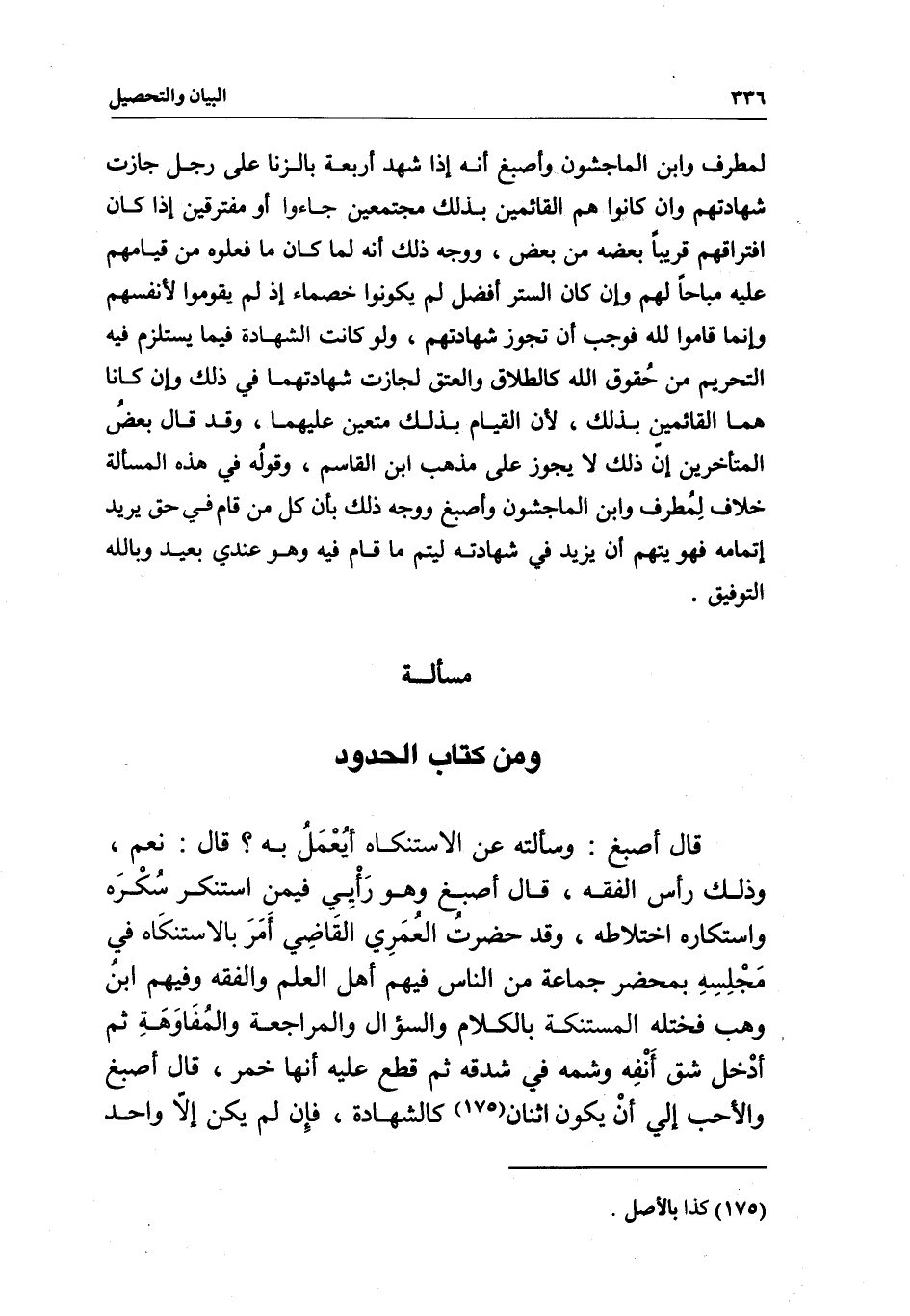 مسألة ومن كتاب الحدود قال أصبغ: وسألته عن الاستنكاه أيعمل به؟ قال: نعم، وذلك رأس الفقه، قال أصبغ: وهو رأيي فيمن استنكر سكره واستكره اختلاطه، وقد حضرت العمري القاضي أمر بالاستنكاه في مجلسه بمحضر جماعة من الناس فيهم أهل العلم والفقه وفيهم ابن وهب فختله المستنكه بالكلام والسؤال والمراجعة والمفاوهة ثم أدخل شق أنفه وشمه في شدقه ثم قطع عليه أنها خمر، قال أصبغ: والأحب إلي أن يكون اثنان كالشهادة، فإن لم يكن إلا واحد