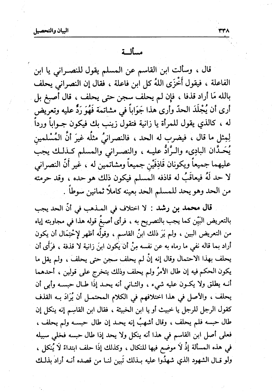 مسألة قال: وسألت ابن القاسم عن المسلم يقول للنصراني يا ابن الفاعلة، فيقول أخزى الله كل ابن فاعلة، فقال: إن النصراني يحلف بالله ما أراد قذفا، فإن لم يحلف سجن حتى يحلف، قال أصبغ: بل أرى أن يجلد الحد وأرى هذا جوابا في مشاتمة فهو رد عليه وتعريض له، كالذي يقول للمرأة يا زانية فتقول زنيت بك فيكون جوابا وردا لمثل ما قال، فيضرب له الحد، فالنصراني مثله غير أن المسلمين يحدان البادئ والراد عليه، والنصراني والمسلم كذلك يجب عليهما جميعا ويكونان قاذفين جميعا ومشاتمين له، غير أن النصراني لا حد له فيعاقب له قاذفه المسلم فيكون ذلك هو حده، وقد حرمته من الحد وهو يحد للمسلم الحد بعينه كاملا ثمانين سوطا.
