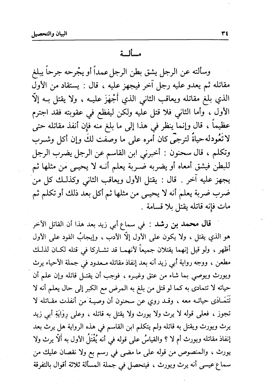 قال محمد بن رشد: في سماع أبي زيد بعد هذا أن القاتل الآخر هو الذي يقتل، ولا يكون على الأول إلا الأدب، وإيجاب القود على الأول أظهر، ولو قيل إنهما يقتلان جميعا لأنهما قد تشاركا في قتله لكان لذلك مطعن، ووجه رواية أبي زيد أنه بعد إنفاذ مقاتله معدود في جملة الأحياء يرث ويورث ويوصي بما شاء من عتق وغيره، فوجب أن يقتل قاتله وإن علم أن حياته لا تتمادى به كما لو قتل من بلغ به المرض مع الكبر إلى حال يعلم أنه لا تتمادى حياته معه، وقد روي عن سحنون أن وصية من أنفذت مقاتله لا تجوز، فعلى قوله لا يرث ولا يورث ولا يقتل به قاتله، وعلى رواية أبي زيد يرث ويورث ويقتل به قاتله ولم يتكلم ابن القاسم في هذه الرواية هل يرث بعد إنفاذ مقاتله ويورث أم لا؟ والقياس على قوله في أنه يقتل الأول به ألا يرث ولا يورث، والمنصوص من قوله على ما مضى في رسم بع ولا نقصان عليك من سماع عيسى أنه يرث ويورث، فيتحصل في جملة المسألة ثلاثة أقوال بالتفرقة