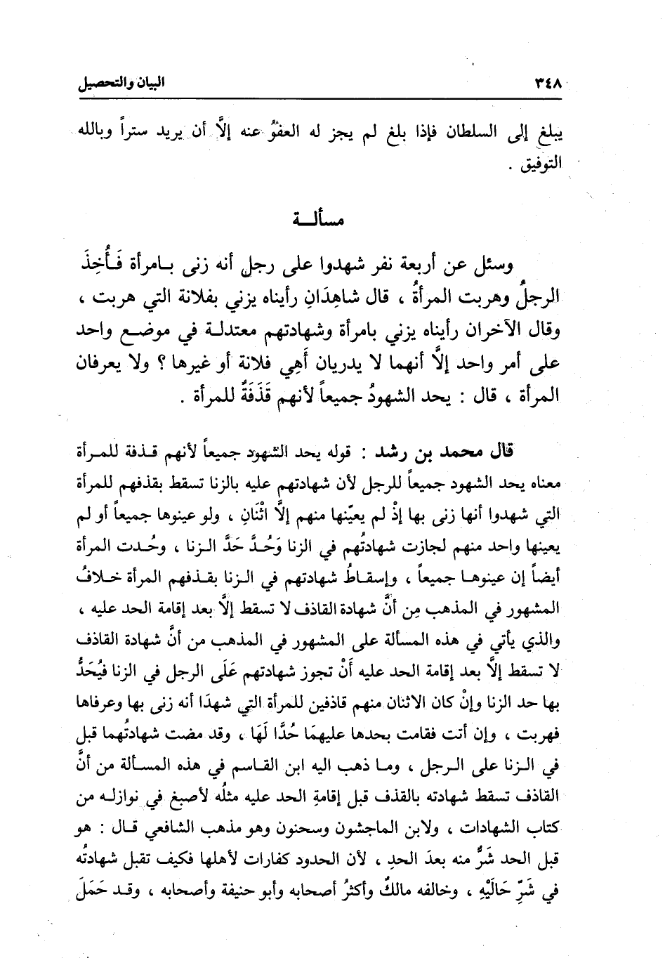 قال محمد بن رشد: قوله: يحد الشهود جميعا لأنهم قذفة للمرأة، معناه: يحد الشهود جميعا للرجل؛ لأن شهادتهم عليه بالزنا تسقط بقذفهم للمرأة التي شهدوا أنها زنى بها؛ إذ لم يعينها منهم إلا اثنان، ولو عينوها جميعا أو لم يعينها واحد منهم لجازت شهادتهم في الزنا وحد حد الزنا، وحدت المرأة أيضا إن عينوها جميعا، وإسقاط شهادتهم في الزنا بقذفهم المرأة خلاف المشهور في المذهب من أن شهادة القاذف لا تسقط إلا بعد إقامة الحد عليه، والذي يأتي في هذه المسألة على المشهور في المذهب من أن شهادة القاذف لا تسقط إلا بعد إقامة الحد عليه أن تجوز شهادتهم على الرجل في الزنا فيحد بها حد الزنا، وإن كان الاثنان منهم قاذفين للمرأة التي شهدا أنه زنى بها وعرفاها فهربت، وإن أتت فقامت بحدها عليهما حدا لها، وقد مضت شهادتهما قبل في الزنا على الرجل، وما ذهب إليه ابن القاسم في هذه المسألة من أن القاذف تسقط شهادته بالقذف قبل إقامة الحد عليه مثله لأصبغ في نوازله من كتاب الشهادات، ولابن الماجشون وسحنون وهو مذهب الشافعي قال: هو قبل الحد شر منه بعد الحد؛ لأن الحدود كفارات لأهلها فكيف تقبل شهادته في شر حاليه، وخالفه مالك وأكثر أصحابه وأبو حنيفة وأصحابه، وقد حمل