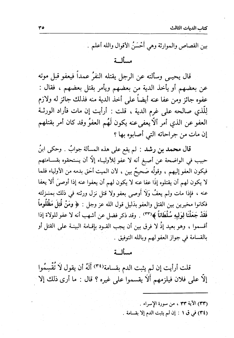 قال محمد بن رشد: لم يقع على هذه المسألة جواب. وحكى ابن حبيب في الواضحة عن أصبغ أنه لا عفو للأولياء إلا أن يستحقوه بقسامتهم فيكون العفو إليهم، وقوله صحيح بين؛ لأن الميت أحق بدمه من الأولياء فلما لا يكون لهم أن يقتلوه إذا عفا عنه لا يكون لهم أن يعفوا عنه إذا أوصى ألا يعفى عنه، فإذا مات ولم يعف ولا أوصى بعفو ولا قتل نزل ورثته في ذلك بمنزلته فكانوا مخيرين بين القتل والعفو بدليل قول الله عز وجل: {وَمَنْ قُتِلَ مَظْلُومًا فَقَدْ جَعَلْنَا لِوَلِيِّهِ سُلْطَانًا} [الإسراء: 33] . وقد ذكر فضل عن أشهب أنه لا عفو للولاة إذا أقسموا، وهو بعيد إذ لا فرق بين أن يجب القود بإقامة البينة على القتل أو بالقسامة في جواز العفو لهم وبالله التوفيق.