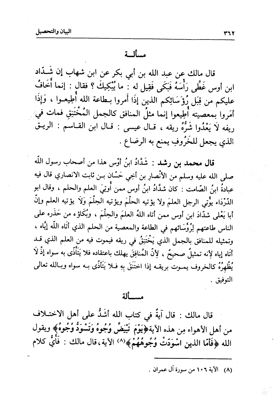 مسألة قال مالك: قال آية في كتاب الله أشد على أهل الاختلاف من أهل الأهواء من هذه الآية {يَوْمَ تَبْيَضُّ وُجُوهٌ وَتَسْوَدُّ وُجُوهٌ} [آل عمران: 106] ويقول الله {فَأَمَّا الَّذِينَ اسْوَدَّتْ وُجُوهُهُمْ} [آل عمران: 106] الآية، قال مالك: فأي كلام
