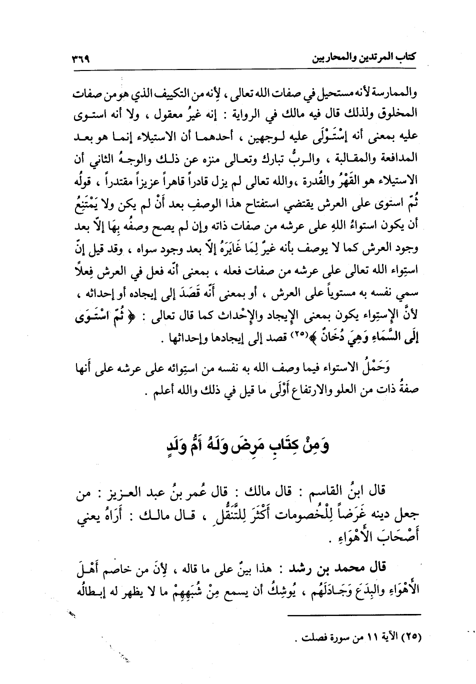 والممارسة؛ لأنه مستحيل في صفات الله تعالى؛ لأنه من التكييف الذي هو من صفات المخلوق، ولذلك قال فيه مالك في الرواية: إنه غير معقول، ولا أنه استوى عليه بمعنى أنه استولى عليه لوجهين، أحدهما: أن الاستيلاء إنما هو بعد المدافعة والمقالبة، والرب تبارك وتعالى منزه عن ذلك، والوجه الثاني: أن الاستيلاء هو القهر والقدرة، والله تعالى لم يزل قادرا قاهرا عزيزا مقتدرا، قوله {ثُمَّ اسْتَوَى عَلَى الْعَرْشِ} [الأعراف: 54] يقتضي استفتاح هذا الوصف بعد أن لم يكن، ولا يمتنع أن يكون استواء الله على عرشه من صفات ذاته، وإن لم يصح وصفه بها إلا بعد وجود العرش، كما لا يوصف بأنه غير لما غايره إلا بعد وجود سواه، وقد قيل: إن استواء الله تعالى على عرشه من صفات فعله، بمعنى أنه فعل في العرش فعلا سمى نفسه به مستويا على العرش، أو بمعنى أنه قصد إلى إيجاده أو إحداثه؛ لأن الاستواء يكون بمعنى الإيجاد والإحداث، كما قال تعالى: {ثُمَّ اسْتَوَى إِلَى السَّمَاءِ وَهِيَ دُخَانٌ} [فصلت: 11] قصد إلى إيجادها وإحداثها.