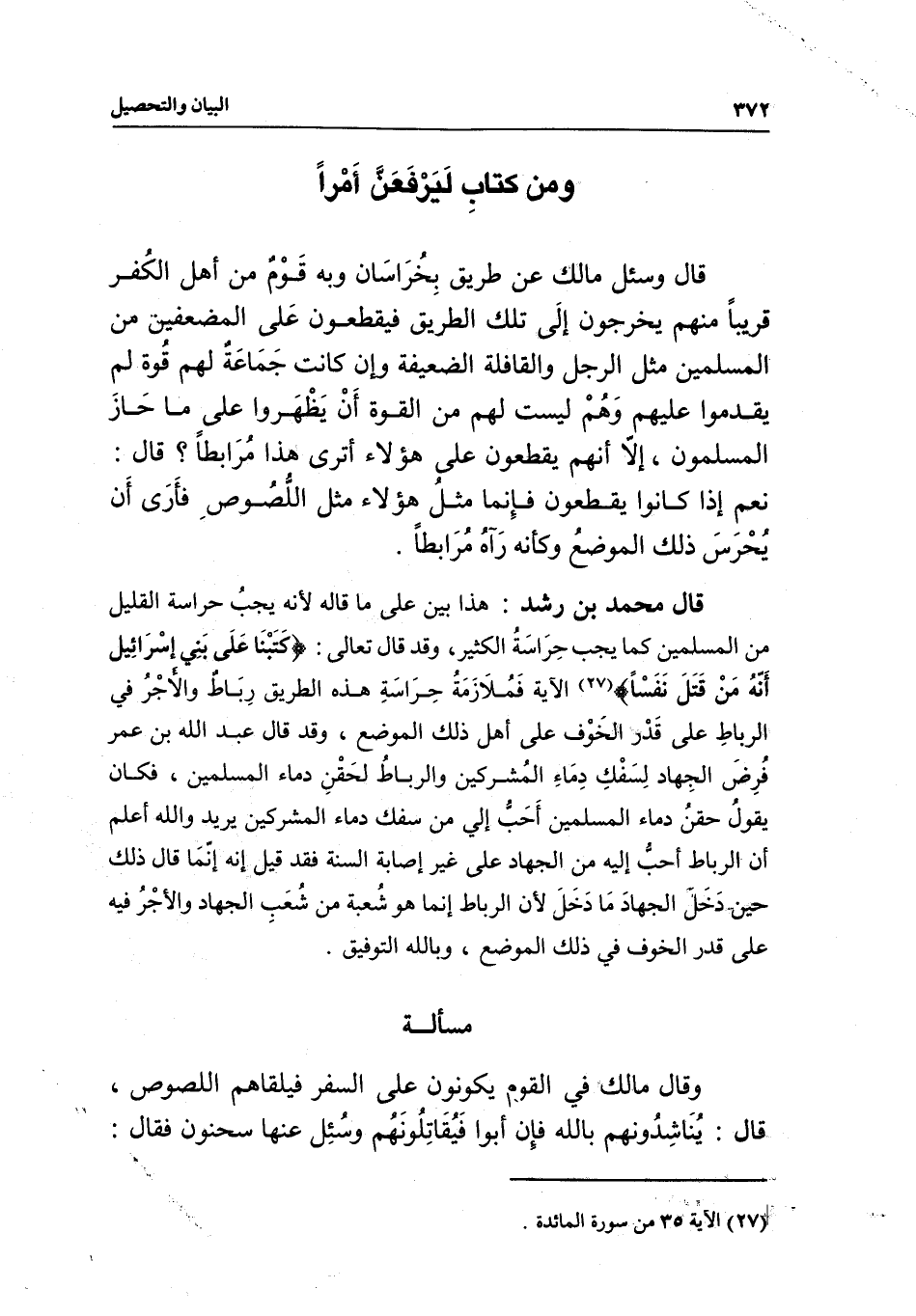 قال محمد بن رشد: هذا بين على ما قاله؛ لأنه يجب حراسة القليل من المسلمين كما يجب حراسة الكثير، وقد قال تعالى: {كَتَبْنَا عَلَى بَنِي إِسْرَائِيلَ أَنَّهُ مَنْ قَتَلَ نَفْسًا} [المائدة: 32] الآية. فملازمة حراسة هذه الطريق رباط، والأجر في الرباط على قدر الخوف على أهل ذلك الموضع، وقد قال عبد الله بن عمر: فرض الجهاد لسفك دماء المشركين، والرباط لحقن دماء المسلمين، فكان يقول: حقن دماء المسلمين أحب إلي من سفك دماء المشركين، يريد والله أعلم: أن الرباط أحب إليه من الجهاد على غير إصابة السنة، فقد قيل: إنه إنما قال ذلك حين دخل الجهاد ما دخل؛ لأن الرباط إنما هو شعبة من شعب الجهاد، والأجر فيه على قدر الخوف في ذلك الموضع، وبالله التوفيق.