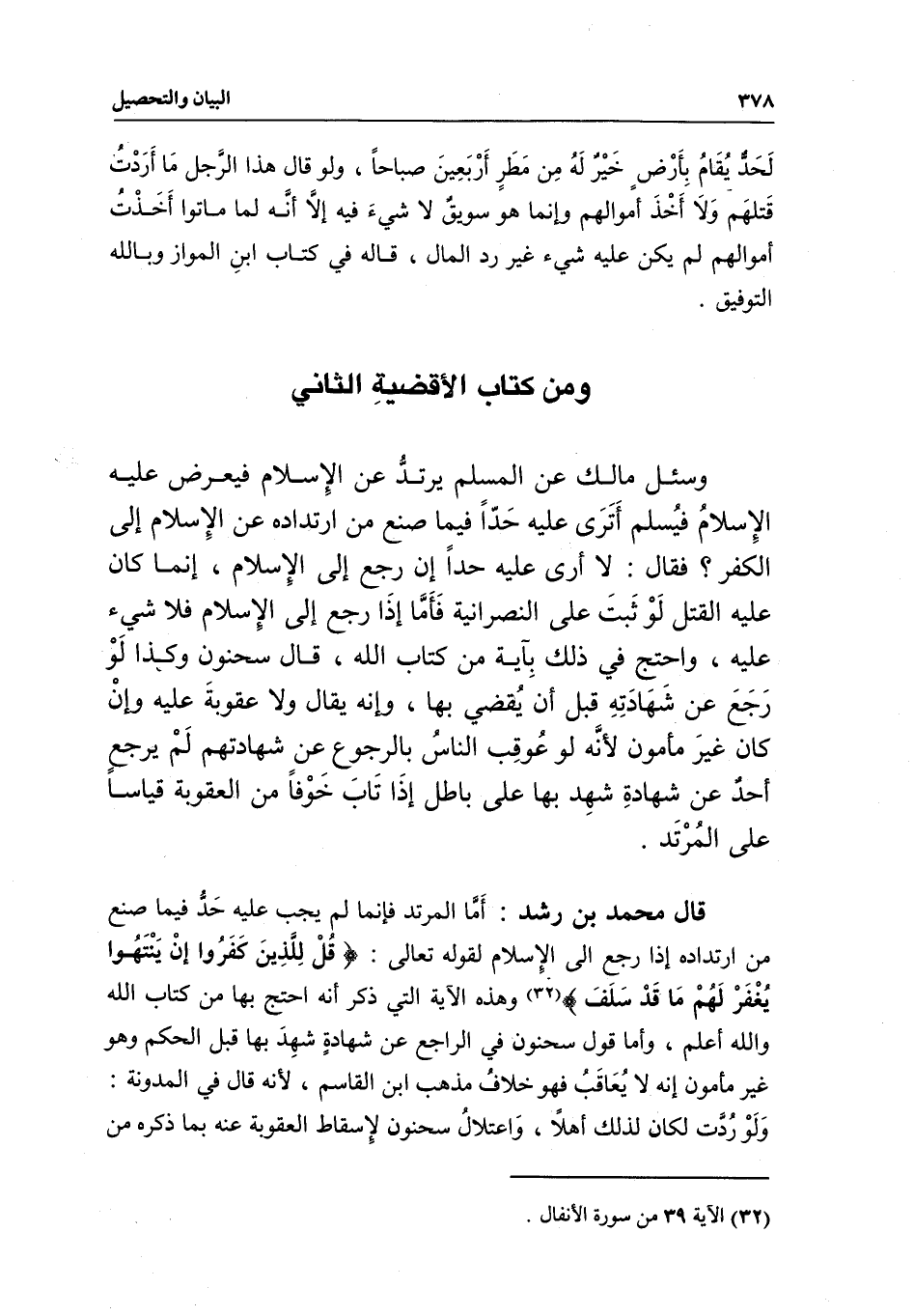 قال محمد بن رشد: أما المرتد فإنما لم يجب عليه حد فيما صنع من ارتداده إذا رجع إلى الإسلام لِقَوْلِهِ تَعَالَى: {قُلْ لِلَّذِينَ كَفَرُوا إِنْ يَنْتَهُوا يُغْفَرْ لَهُمْ مَا قَدْ سَلَفَ} [الأنفال: 38] وهذه الآية التي ذكر أنه احتج بها من كتاب الله، والله أعلم، وأما قول سحنون في الراجع عن شهادة شهد بها قبل الحكم وهو غير مأمون: إنه لا يعاقب، فهو خلاف مذهب ابن القاسم؛ لأنه قال في المدونة: ولو ردت لكان لذلك أهلا، واعتلال سحنون لإسقاط العقوبة عنه بما ذكره من