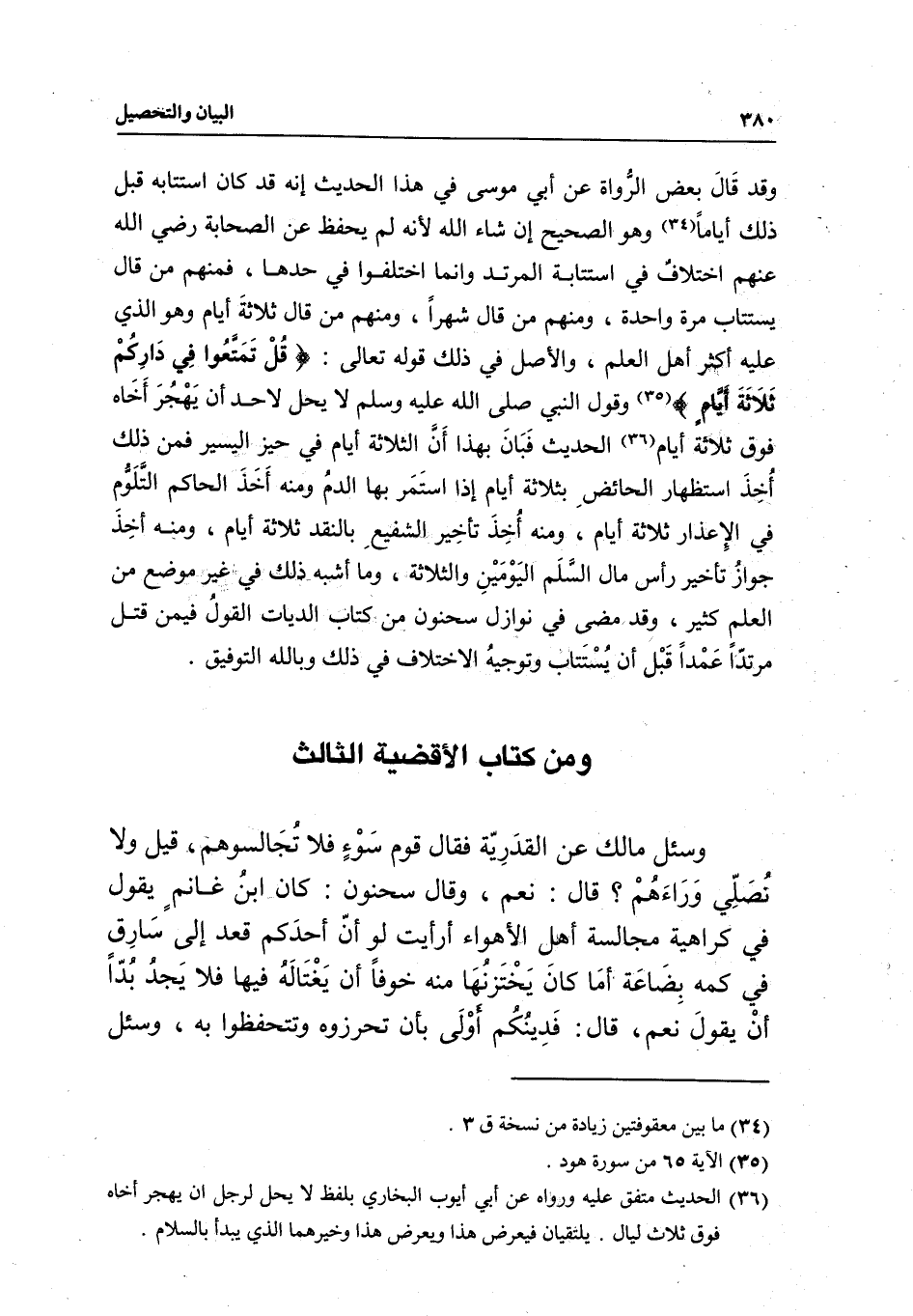 ومن كتاب الأقضية الثالث وسئل مالك عن القدرية فقال: قوم سوء فلا تجالسوهم، قيل: ولا نصلي وراءهم؟ قال: نعم، وقال سحنون: كان ابن غانم يقول في كراهية مجالسة أهل الأهواء: أرأيت لو أن أحدكم قعد إلى سارق في كمه بضاعة أما كان يختزنها منه خوفا أن يغتاله فيها فلا يجد بدا أن يقول نعم، قال: فدينكم أولى بأن تحرزوه وتتحفظوا به، وسئل