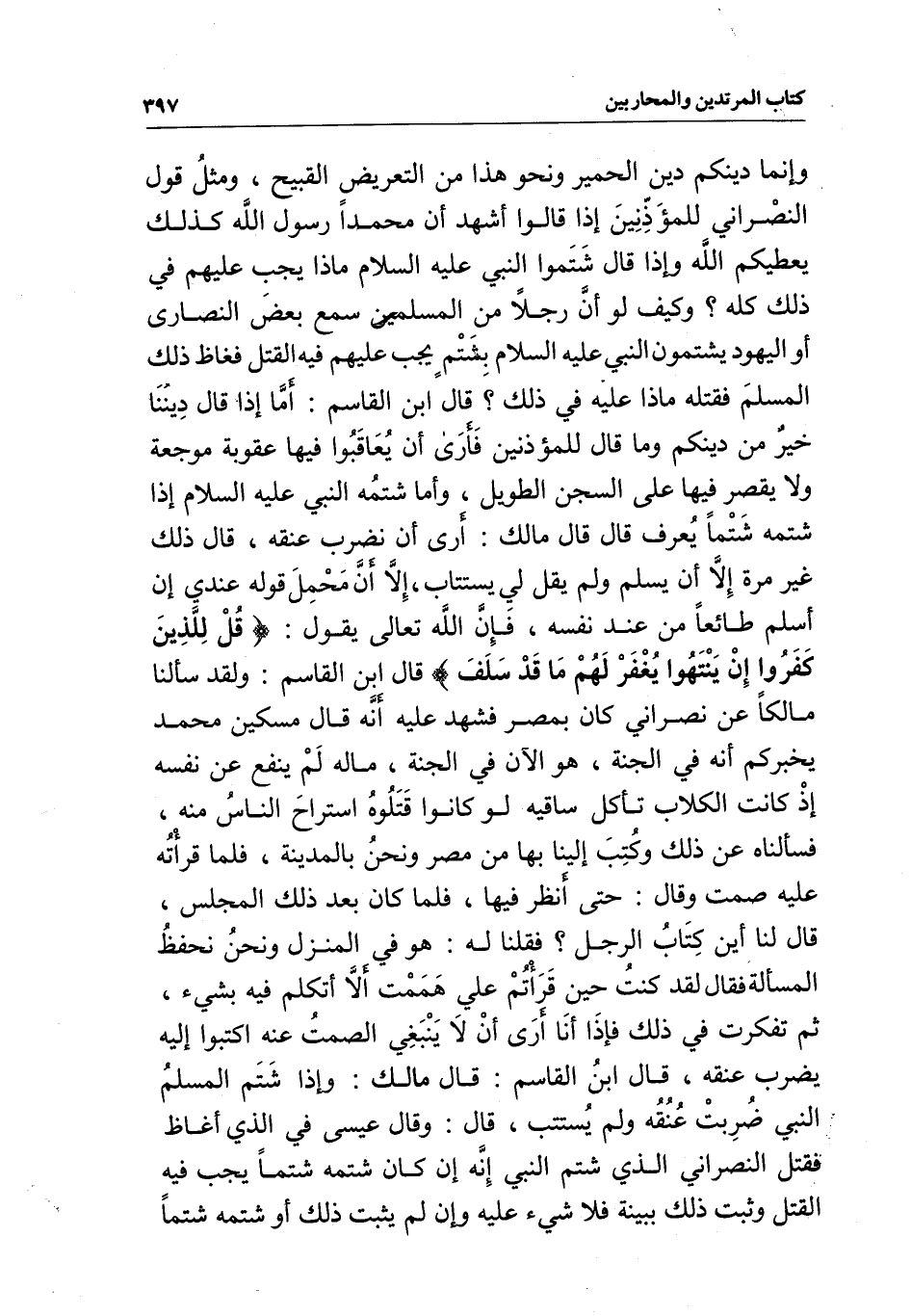 قال ابن القاسم: ولقد سألنا مالكا عن نصراني كان بمصر، فشهد عليه أنه قال: مسكين محمد يخبركم أنه في الجنة، هو الآن في الجنة، ما له لم ينفع عن نفسه إذ كانت الكلاب تأكل ساقيه لو كانوا قتلوه استراح الناس منه، فسألناه عن ذلك، وكتب إلينا بها من مصر، ونحن بالمدينة، فلما قرأته عليه صمت، وقال: حتى أنظر فيها، فلما كان بعد ذلك المجلس، قال لنا: أين كتاب الرجل؟ فقلنا له: هو في المنزل، ونحن نحفظ المسألة، فقال: لقد كنت حين قرأتم علي هممت ألا أتكلم فيه بشيء، ثم تفكرت في ذلك، فإذا أنا أرى أن لا ينبغي الصمت عنه اكتبوا إليه ضرب عنقه، قال ابن القاسم: قال مالك: وإذا شتم المسلم النبي ضربت عنقه، ولم يستتب، قال: وقال عيسى في الذي أغاظ قتل النصراني الذي شتم النبي: إنه إن كان شتمه شتما يجب فيه قتل، وثبت ذلك ببينة، فلا شيء عليه، وإن لم يثبت ذلك أو شتمه شتما،
