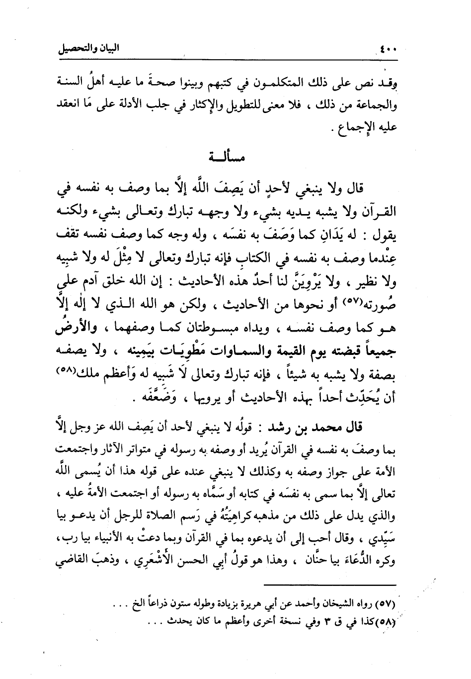 قال محمد بن رشد: قوله: لا ينبغي لأحد أن يصف الله عز وجل إلا بما وصف به نفسه في القرآن يريد، أو وصفه به رسوله في متواتر الآثار، واجتمعت الأمة على جواز وصفه به، وكذلك لا ينبغي عنده على قوله هذا أن يسمى الله تعالى إلا بما سمى به نفسه في كتابه أو سماه به رسوله، أو اجتمعت الأمة عليه، والذي يدل على ذلك من مذهبه كراهيته في رسم الصلاة للرجل أن يدعو بيا سيدي، وقال: أحب إلي أن يدعوه بما في القرآن، وبما دعت به الأنبياء بيا رب، وكره الدعاء بيا حنان، وهذا هو قول أبي الحسن الأشعري، وذهب القاضي