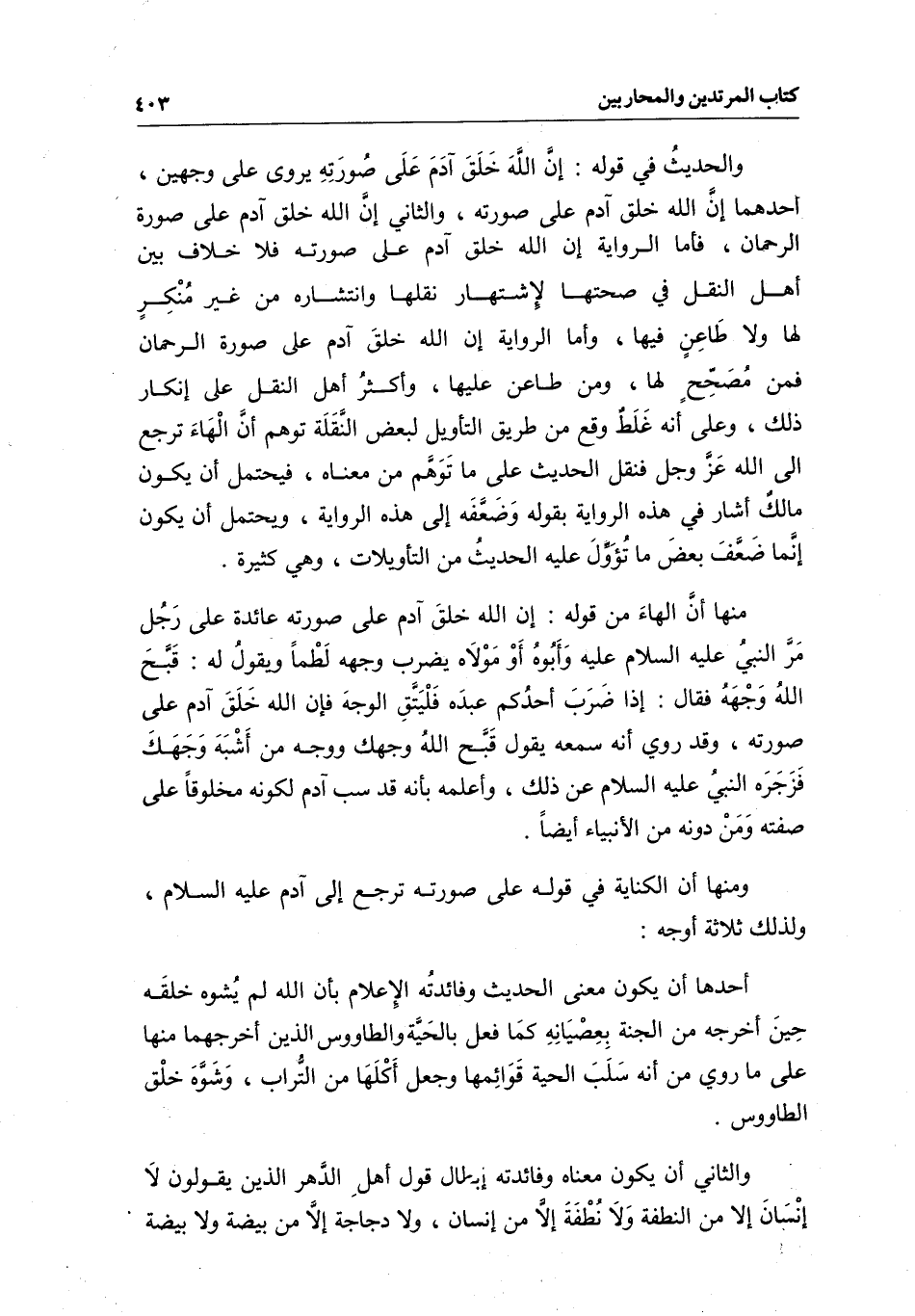 منها أن الهاء من قوله: «إن الله خلق آدم على صورته؛» عائدة على رجل «مر النبي - عَلَيْهِ السَّلَامُ - عليه وأبوه أو مولاه يضرب وجهه لطما، ويقول له: قبح الله وجهه، فقال: إذا ضرب أحدكم عبده فليتق الوجه، فإن الله خلق آدم على صورته» وقد «روي أنه سمعه يقول: قبح الله وجهك، ووجه من أشبه وجهك، فزجره النبي - عَلَيْهِ السَّلَامُ - عن ذلك، وأعلمه بأنه قد سب آدم؛» لكونه مخلوقا على صفته ومن دونه من الأنبياء أيضا.