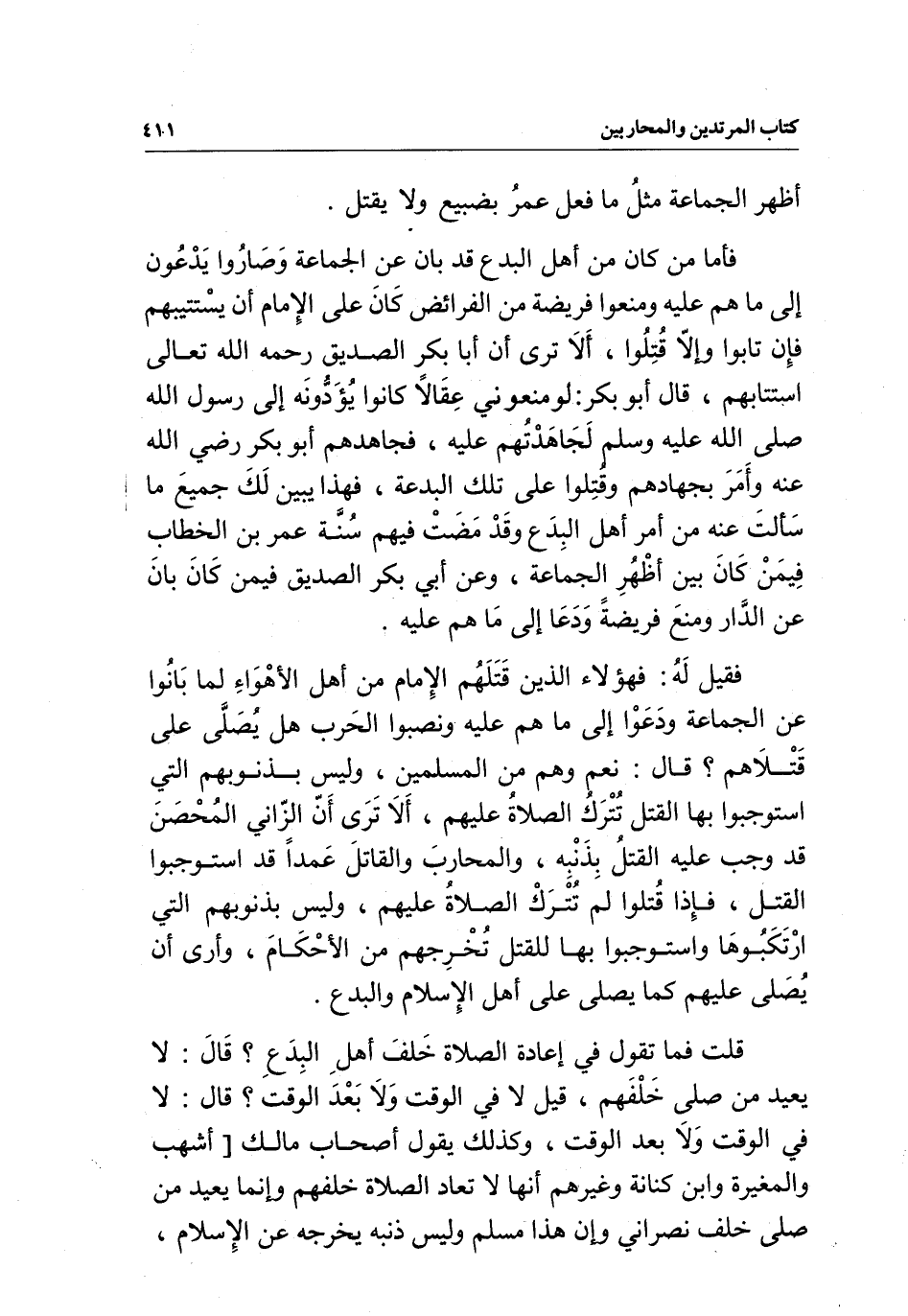 فأما من كان من أهل البدع، قد بان عن الجماعة، وصاروا يدعون إلى ما هم عليه، ومنعوا فريضة من الفرائض كان على الإمام أن يستتيبهم، فإن تابوا وإلا قتلوا، ألا ترى أن أبا بكر الصديق - رَحِمَهُ اللَّهُ تَعَالَى - استتابهم، قال أبو بكر: لو منعوني عقالا كانوا يؤدونه إلى رسول الله - صَلَّى اللَّهُ عَلَيْهِ وَسَلَّمَ - لجاهدتهم عليه، فجاهدهم أبو بكر - رَضِيَ اللَّهُ عَنْهُ - وأمر بجهادهم، وقتلوا على تلك البدعة، فهذا يبين لك جميع ما سألت عنه من أمر أهل البدع، وقد مضت فيهم سنة عمر بن الخطاب فيمن كان بين أظهر الجماعة، وعن أبي بكر الصديق فيمن كان بان عن الدار، ومنع فريضة، ودعا إلى ما هم عليه.