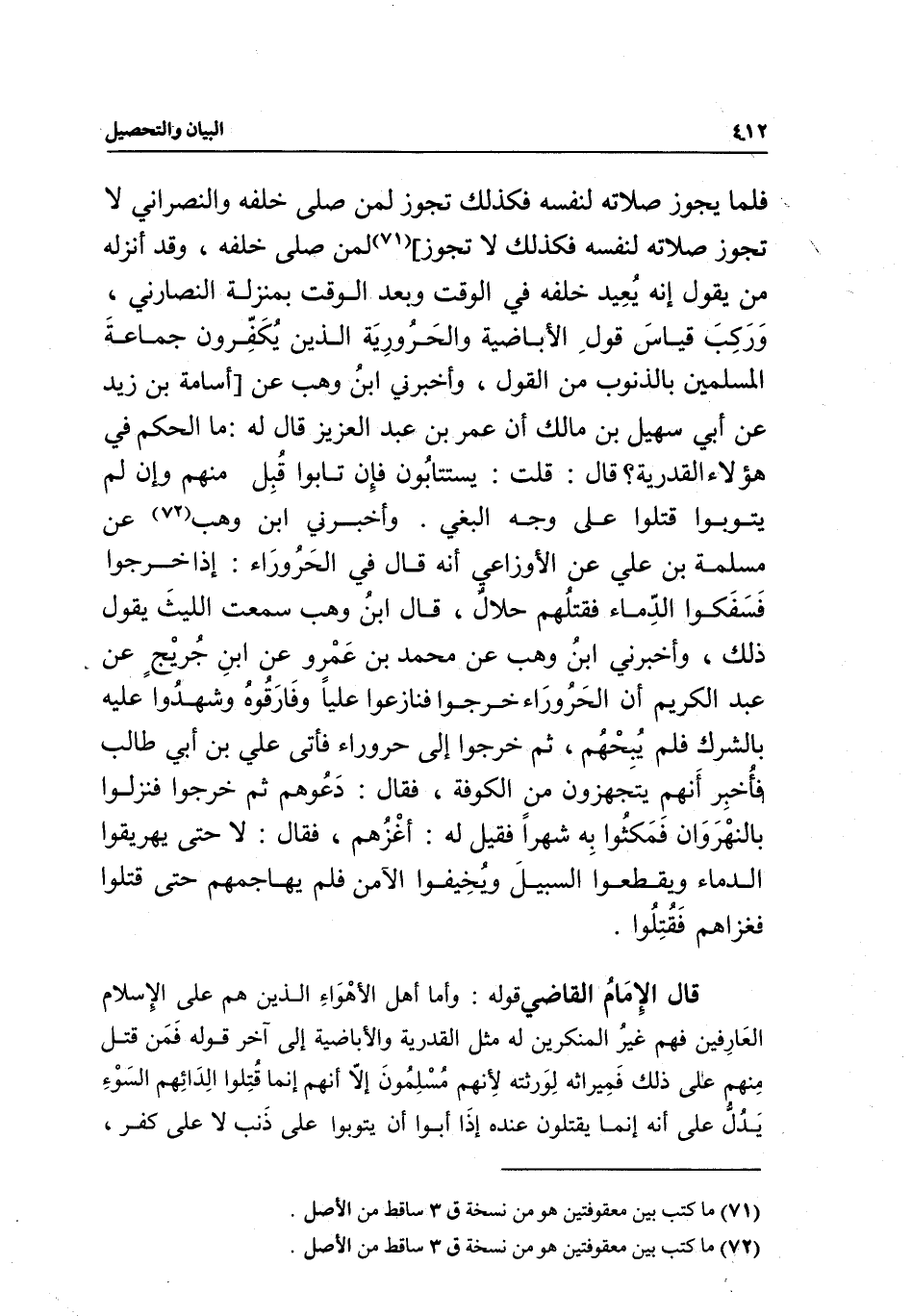 فلما يجوز صلاته لنفسه، فكذلك تجوز لمن صلى خلفه، والنصراني لا تجوز صلاته لنفسه، فكذلك لا تجوز لمن صلى خلفه، وقد أنزله من يقول: إنه يعيد خلفه في الوقت وبعد الوقت بمنزلة النصراني، وركب قياس قول الإباضية والحرورية الذين يكفرون جماعة المسلمين بالذنوب من القول، وأخبرني ابن وهب عن أسامة بن زيد، عن أبي سهيل بن مالك: أن عمر بن عبد العزيز قال له: ما الحكم في هؤلاء القدرية؟ قال: قلت: يستتابون، فإن تابوا قبل منهم، وإن لم يتوبوا قتلوا على وجه البغي.