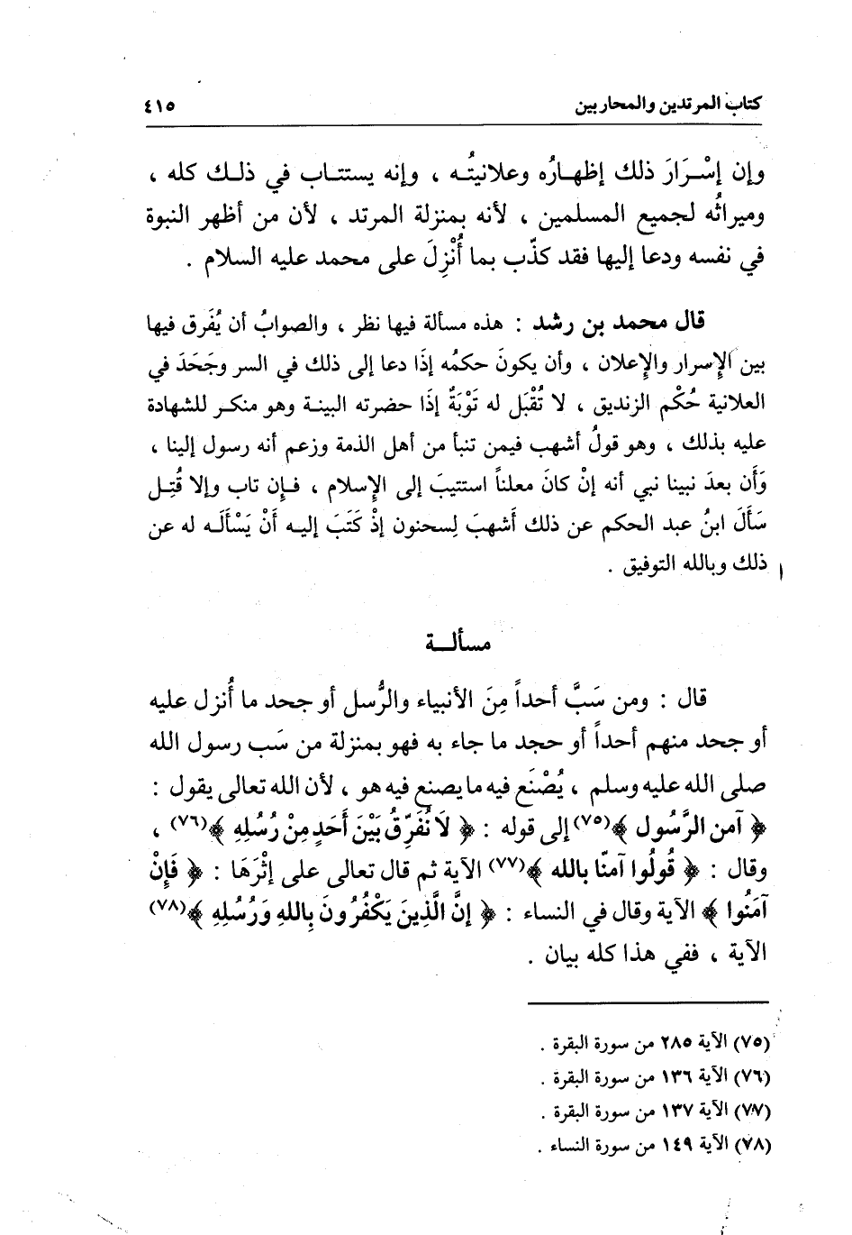 قال: ومن سب أحدا من الأنبياء والرسل، أو جحد ما أنزل عليه، أو جحد منهم أحدا، أو حجد ما جاء به فهو بمنزلة من سب رسول الله - صَلَّى اللَّهُ عَلَيْهِ وَسَلَّمَ -، يصنع فيه ما يصنع فيه هو؛ لأن الله تعالى يقول: {آمَنَ الرَّسُولُ} [البقرة: 285] إلى قوله: {لا نُفَرِّقُ بَيْنَ أَحَدٍ مِنْ رُسُلِهِ} [البقرة: 285] ، وقال: {قُولُوا آمَنَّا بِاللَّهِ} [البقرة: 136] الآية، ثم قال تعالى على إثرها: {فَإِنْ آمَنُوا} [البقرة: 137] الآية، وقال في النساء: {إِنَّ الَّذِينَ يَكْفُرُونَ بِاللَّهِ وَرُسُلِهِ} [النساء: 150] الآية، ففي هذا كله بيان.