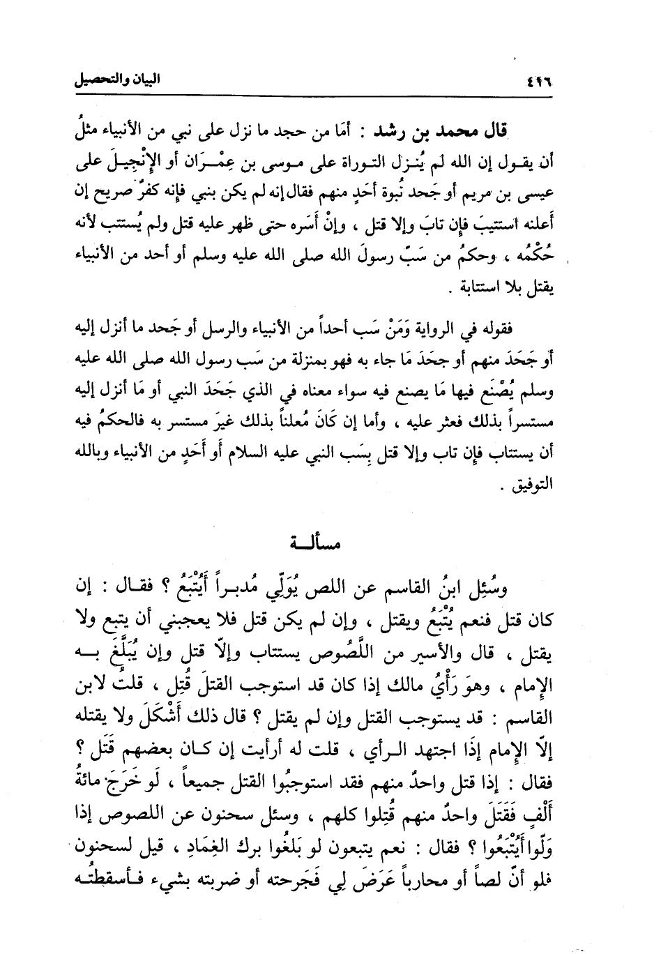 قال محمد بن رشد: أما من جحد ما نزل على نبي من الأنبياء مثل أن يقول: إن الله لم ينزل التوراة! على موسى بن عمران، أو الإنجيل على عيسى ابن مريم، أو جحد نبوة أحد منهم فقال: إنه لم يكن بنبي، فإنه كفر صريح إن أعلنه استتيب، فإن تاب وإلا قتل، وإن أسره حتى ظهر عليه قتل، ولم يستتب؛ لأنه حكمه، وحكم من سب رسول الله - صَلَّى اللَّهُ عَلَيْهِ وَسَلَّمَ - أو أحد من الأنبياء يقتل بلا استتابة.