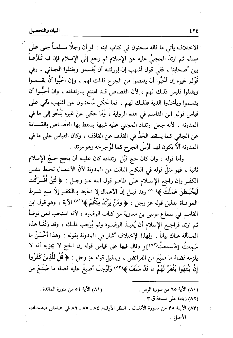 وقد قيل: إن الأعمال لا تحبط بالكفر إلا مع شرط الموافاة؛ بدليل قوله عز وجل: {وَمَنْ يَرْتَدِدْ مِنْكُمْ} [البقرة: 217] الآية، وهو قول ابن القاسم في سماع موسى بن معاوية، من كتاب الوضوء؛ لأنه استحب لمن توضأ ثم ارتد، فراجع الإسلام أن يعيد الوضوء ولم يوجب ذلك، وقد زدنا هذه المسألة هناك بيانا، ولهذا الاختلاف أشار في المدونة بقوله: وهذا أحسن ما سمعت [فأسمعت] ، وقال فيها على قياس قوله: إن الحج لا يجزيه أنه لا يلزمه قضاء ما ضيع من الفرائض، وبدليل قوله عز وجل: {قُلْ لِلَّذِينَ كَفَرُوا إِنْ يَنْتَهُوا يُغْفَرْ لَهُمْ مَا قَدْ سَلَفَ} [الأنفال: 38] وأوجب أصبغ عليه قضاء ما صنع من
