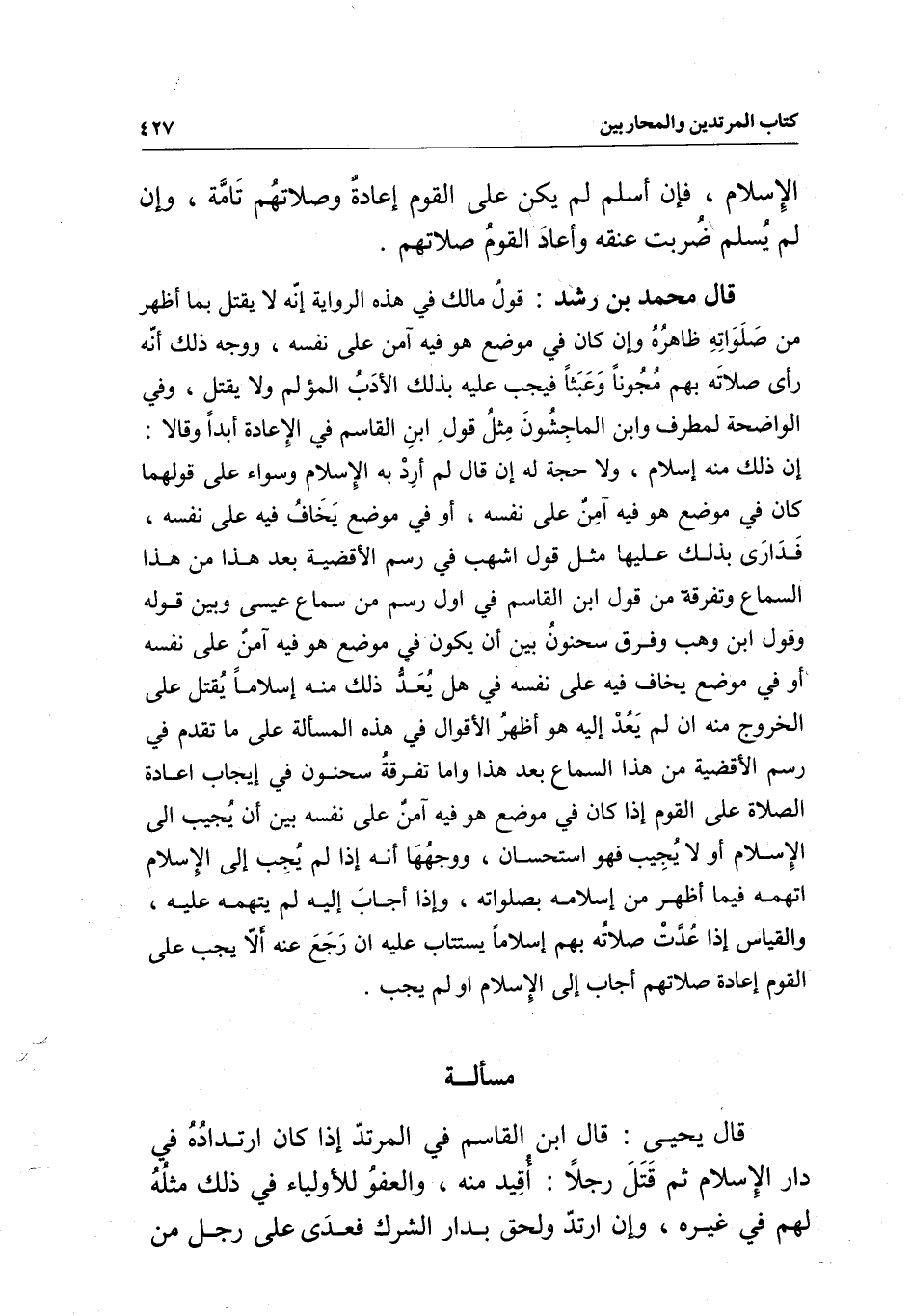 قال محمد بن رشد: قول مالك في هذه الرواية: إنه لا يقتل بما أظهر من صلواته ظاهره، وإن كان في موضع هو فيه آمن على نفسه، ووجه ذلك أنه رأى صلاته بهم مجونا وعبثا، فيجب عليه بذلك الأدب المؤلم ولا يقتل، وفي الواضحة لمطرف وابن الماجشون مثل قول ابن القاسم في الإعادة أبدا، وقالا: إن ذلك منه إسلام، ولا حجة له إن قال: لم أرد به الإسلام، وسواء على قولهما كان في موضع هو فيه آمن على نفسه، أو في موضع يخاف فيه على نفسه، فدارى بذلك عليها مثل قول أشهب في رسم الأقضية بعد هذا من هذا السماع، وتفرقة من قول ابن القاسم في أول رسم من سماع عيسى، وبين قوله وقول ابن وهب، وفرق سحنون بين أن يكون في موضع هو فيه آمن على نفسه، أو في موضع يخاف فيه على نفسه في هل يعد ذلك منه إسلاما يقتل على الخروج منه إن لم يعد إليه، هو أظهر الأقوال في هذه المسألة على ما تقدم في رسم الأقضية من هذا السماع بعد هذا، وأما تفرقة سحنون في إيجاب إعادة الصلاة على القوم إذا كان في موضع هو فيه آمن على نفسه بين أن يجيب إلى الإسلام أو لا يجيب فهو استحسان، ووجهها أنه إذا لم يجب إلى الإسلام اتهمه فيما أظهر من إسلامه بصلواته، وإذا أجاب إليه لم يتهمه عليه، والقياس إذا عدت صلاته بهم إسلاما يستتاب عليه إن رجع عنه، ألا يجب على القوم إعادة صلاتهم، أجاب إلى الإسلام أو لم يجب.