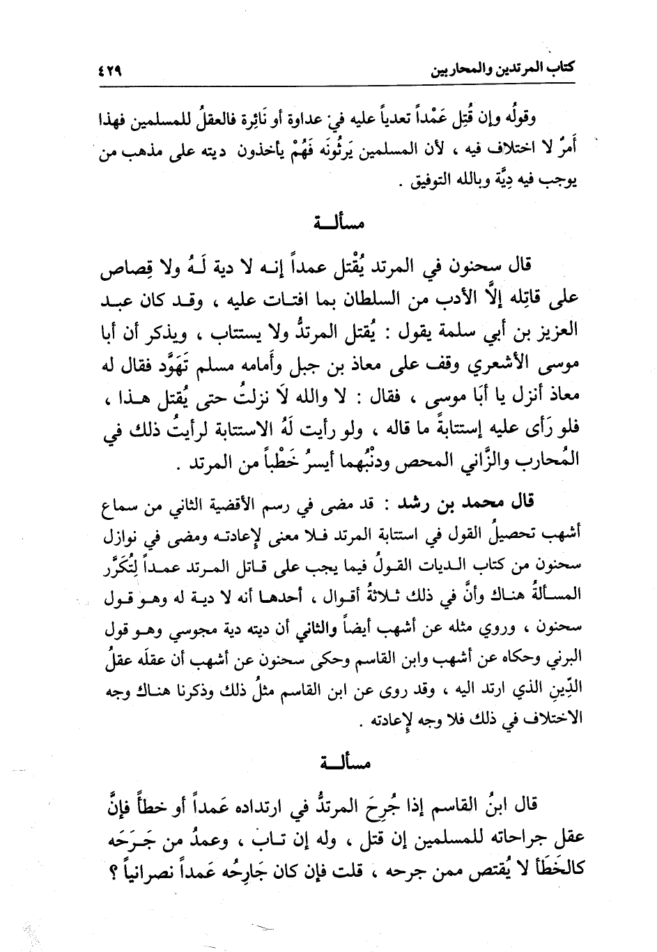 مسألة قال سحنون في المرتد يقتل عمدا: إنه لا دية له ولا قصاص على قاتله، إلا الأدب من السلطان بما افتات عليه، وقد كان عبد العزيز بن أبي سلمة يقول: يقتل المرتد ولا يستتاب، ويذكر أن أبا موسى الأشعري وقف على معاذ بن جبل، وأمامه مسلم تهود، فقال له معاذ: انزل يا أبا موسى، فقال: لا والله لا نزلت حتى يقتل هذا، فلو رأى عليه استتابة ما قاله، ولو رأيت له الاستتابة لرأيت ذلك في المحارب والزاني المحصن، وذنبهما أيسر خطبا من المرتد.