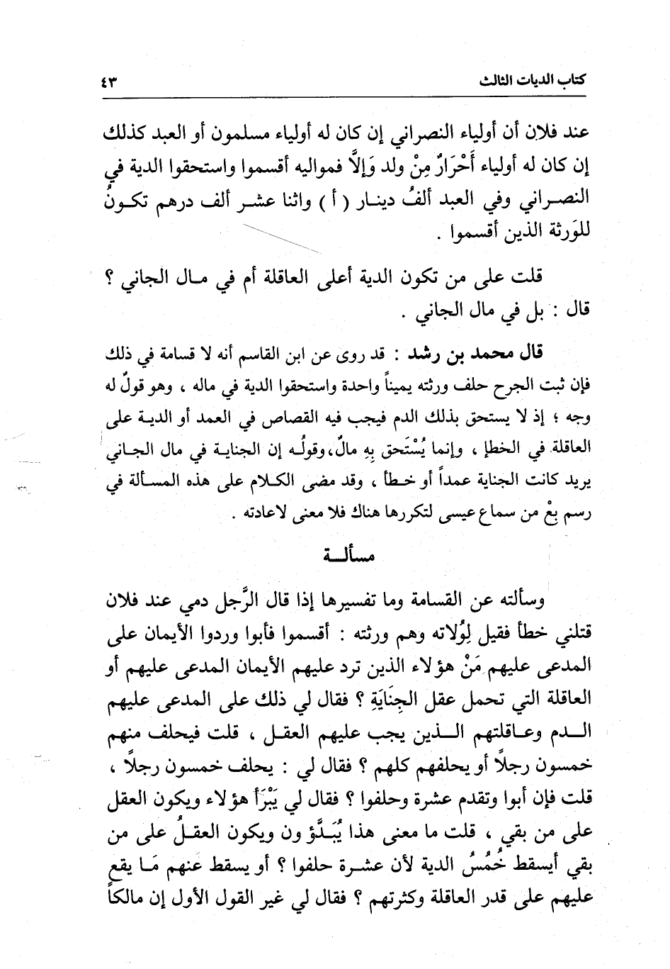 مسألة وسألته عن القسامة وما تفسيرها إذا قال الرجل: دمي عند فلان قتلني خطأ فقيل لولاته وهم ورثته: أقسموا فأبوا وردوا الأيمان على المدعى عليهم من هؤلاء الذين ترد عليهم الأيمان المدعى عليهم أو العاقلة التي تحمل عقل الجناية؟ فقال لي: ذلك على المدعى عليهم الدم وعاقلتهم الذين يجب عليهم العقل، قلت فيحلف منهم خمسون رجلا أو يحلفهم كلهم؟ فقال لي: يحلف خمسون رجلا، قلت: فإن أبوا وتقدم عشرة وحلفوا؟ فقال لي: يبرأ هؤلاء ويكون العقل على من بقي، قلت: ما معنى هذا يبدؤون ويكون العقل على من بقي أيسقط خمس الدية لأن عشرة حلفوا؟ أو يسقط عنهم ما يقع عليهم على قدر العاقلة وكثرتهم؟ فقال لي غير القول الأول إن مالكا