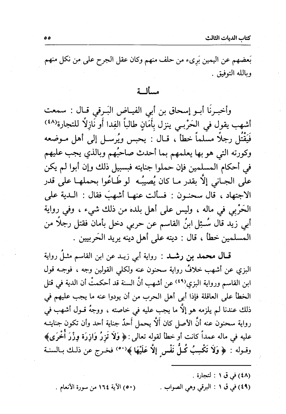 مسألة وأخبرنا أبو إسحاق بن أبي الفياض البرقي قال: سمعت أشهب يقول في الحربي ينزل بأمان طالبا الفدا أو نازلا للتجارة فيقتل رجلا مسلما خطأ، قال: يحبس ويرسل إلى أهل موضعه وكورته التي هو بها يعلمهم بما أحدث صاحبهم وبالذي يجب عليهم في أحكام المسلمين فإن حملوا جنايته فبسبيل ذلك وإن أبوا لم يكن على الجاني إلا بقدر ما كان يصيبه لو أطاعوا بحملها على قدر الاجتهاد، قال سحنون: فسألت عنها أشهب فقال: الدية على الحربي في ماله، وليس على أهل بلده من ذلك شيء، وفي رواية أبي زيد قال سئل ابن القاسم عن حربي دخل بأمان فقتل رجلا من المسلمين خطأ، قال: ديته على أهل دينه يريد الحربيين.