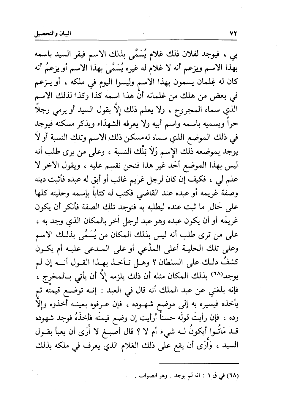 بي، فيوجد لفلان ذلك غلام يسمى بذلك الاسم فيقر السيد باسمه بهذا الاسم ويزعم أنه لا غلام له غيره يسمى بهذا الاسم أو يزعم أنه كان له غلمان يسمون بهذا الاسم وليسوا اليوم في ملكه، أو يزعم في بعض من هلك من غلمانه أن هذا اسمه كذا وكذا لذلك الاسم الذي سماه المجروح، ولا يعلم ذلك إلا بقول السيد أو يرمي رجلا حرا ويسميه باسمه واسم أبيه ولا يعرفه الشهداء ويذكر مسكنه فيوجد في ذلك الموضع الذي سماه له مسكن ذلك الاسم وتلك النسبة أو لا يوجد بموضعه ذلك الاسم ولا تلك النسبة، وعلى من يرى طلب أنه ليس بهذا الموضع أحد غير هذا فنحن نقسم عليه، ويقول الآخر لا علم لي، فكيف إن كان لرجل غريم غائب أو أبق له عبده فأثبت دينه وصفة غريمه أو عبده عند القاضي فكتب له كتابا باسمه وحليته كلها على حال ما ثبت عنده ليطلبه به فتوجد تلك الصفة فأنكر أن يكون غريمه أو أن يكون عبده وهو عبد لرجل آخر بالمكان الذي وجد به، على من ترى طلب أنه ليس بذلك المكان من يسمى بذلك الاسم وعلى تلك الحلية أعلى المدعي أو على المدعى عليه أم يكون كشف ذلك على السلطان؟ وهل تأخذ بهذا القول أنه إن لم يوجد بذلك المكان مثله أن ذلك يلزمه إلا أن يأتي بالمخرج، فإنه بلغني عن عبد الملك أنه قال في العبد: إنه توضع قيمته ثم يأخذه فيسيره به إلى موضع شهوده، فإن عرفوه بعينه أخذوه وإلا رده، فإن رأيت قوله حسنا أرأيت إن وضع قيمته فأخذه فوجد شهوده قد ماتوا أيكون له شيء أم لا؟ قال أصبغ لا أرى أن يعبأ بقول السيد، وأرى أن يقع على ذلك الغلام الذي يعرف في ملكه بذلك