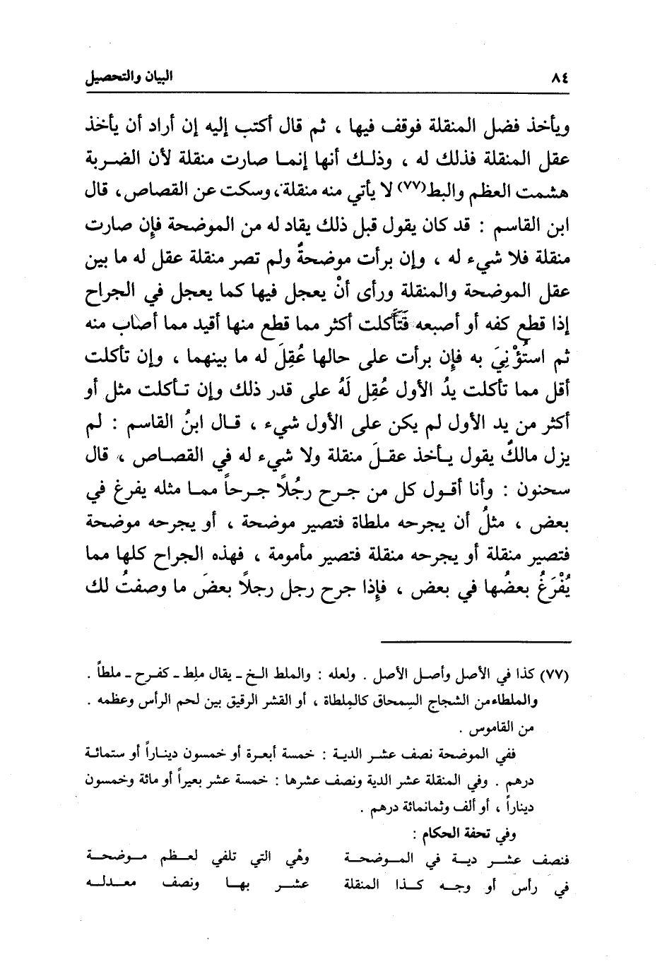 ويأخذ فضل المنقلة فوقف فيها، ثم قال: أكتب إليه إن أراد أن يأخذ عقل المنقلة فذلك له، وذلك أنها إنما صارت منقلة لأن الضربة هشمت العظم والبط لا يأتي منه منقلة، وسكت عن القصاص، قال ابن القاسم: قد كان يقول قبل ذلك يقاد له من الموضحة فإن صارت منقلة فلا شيء له، وإن برأت موضحة ولم تصر منقلة عقل له ما بين عقل الموضحة والمنقلة ورأى أن يعجل فيها كما يعجل في الجراح إذا قطع كفه أو أصبعه فتآكلت أكثر مما قطع منها أقيد مما أصاب منه ثم استؤني به فإن برأت على حالها عقل له ما بينهما، وإن تآكلت أقل مما أكلت يد الأول عقل له على قدر ذلك وإن أكلت مثل أو أكثر من يد الأول لم يكن على الأول شيء، قال ابن القاسم: لم يزل مالك يقول يأخذ عقل منقلة ولا شيء له في القصاص، قال سحنون: وأنا أقول كل من جرح رجلا جرحا مما مثله يفرغ في بعض، مثل أن يجرحه ملطاة فتصير موضحة، أو يجرحه موضحة فتصير منقلة أو يجرحه منقلة فتصير مأمومة، فهذه الجراح كلها مما يفرغ بعضها في بعض، فإذا جرح رجل رجلا بعض ما وصفت لك