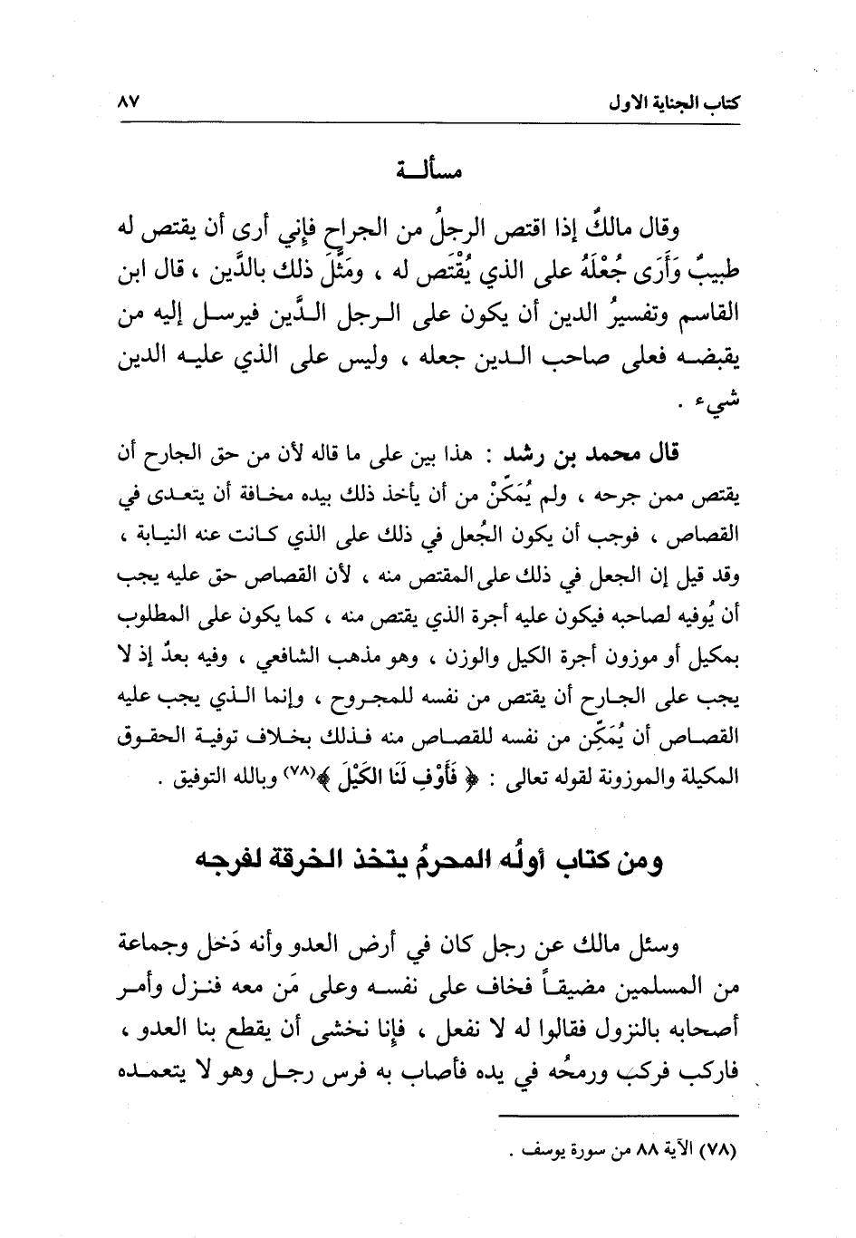 قال محمد بن رشد: هذا بيّن على ما قاله لأن من حق الجارح أن يقتص ممن جرحه، ولم يمكن من أن يأخذ ذلك بيده مخافة أن يتعدى في القصاص، فوجب أن يكون الجعل في ذلك على الذي كانت عنه النيابة، وقد قيل إن الجعل في ذلك على المقتص منه؛ لأن القصاص حق عليه يجب أن يوفيه لصاحبه فيكون عليه أجرة الذي يقتص منه، كما يكون على المطلوب بمكيل أو موزون أجرة الكيل والوزن، وهو مذهب الشافعي، وفيه بُعد إذ لا يجب على الجارح أن يقتص من نفسه للمجروح، وإنما الذي يجب عليه القصاص أن يمكن من نفسه للقصاص منه فذلك بخلاف توفية الحقوق المكيلة والموزونة لِقَوْلِهِ تَعَالَى: {فَأَوْفِ لَنَا الْكَيْلَ} [يوسف: 88] وبالله التوفيق.