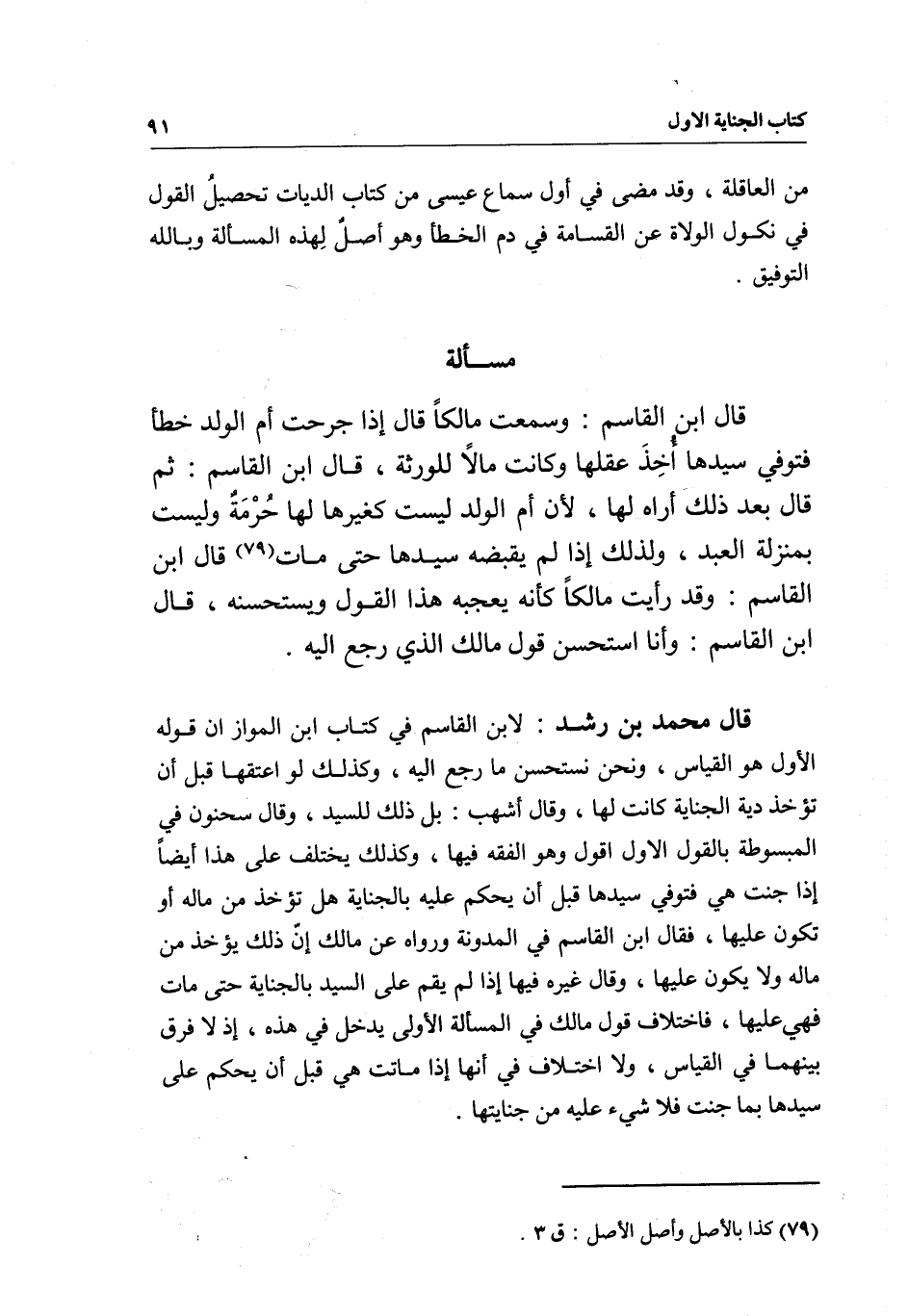 مسألة قال ابن القاسم: وسمعت مالكا قال: إذا جرحت أم الولد خطأ فتوفي سيدها أخذ عقلها وكانت مالا للورثة، قال ابن القاسم: ثم قال بعد ذلك أراه لها؛ لأن أم الولد ليست كغيرها لها حرمة وليست بمنزلة العبد، ولذلك إذا لم يقبضه سيدها حتى مات قال ابن القاسم: وقد رأيت مالكا كأنه يعجبه هذا القول ويستحسنه، قال ابن القاسم: وأنا استحسن قول مالك الذي رجع إليه.