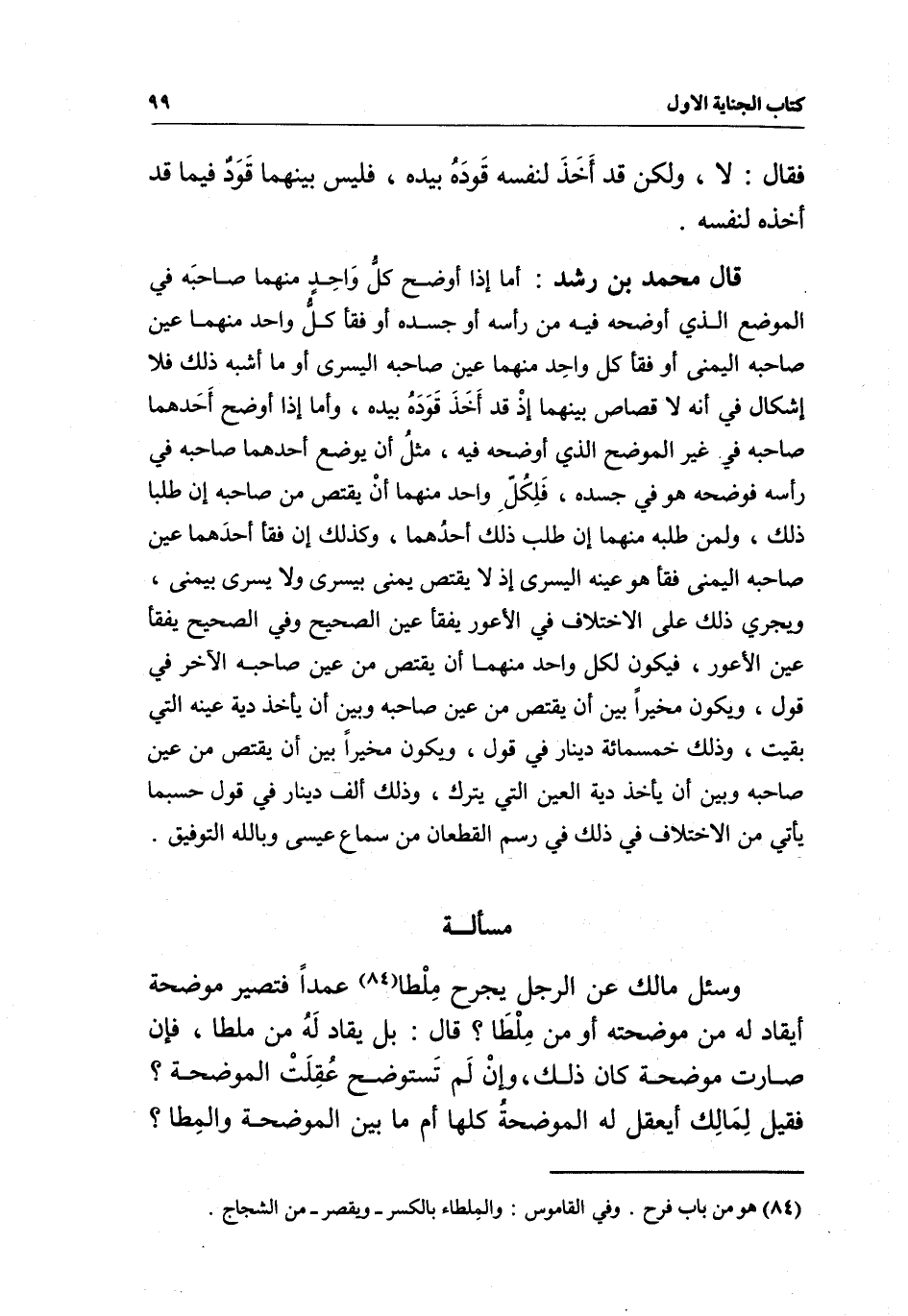 مسألة وسئل مالك عن الرجل يجرح ملطا عمدا فتصير موضحة أيقاد له من موضحته أو من ملطا؟ قال: بل يقاد له من ملطا، فإن صارت موضحة كان ذلك، وإن لم تستوضح عقلت الموضحة؟ فقيل لمالك أيعقل له الموضحة كلها أم ما بين الموضحة والمطا؟