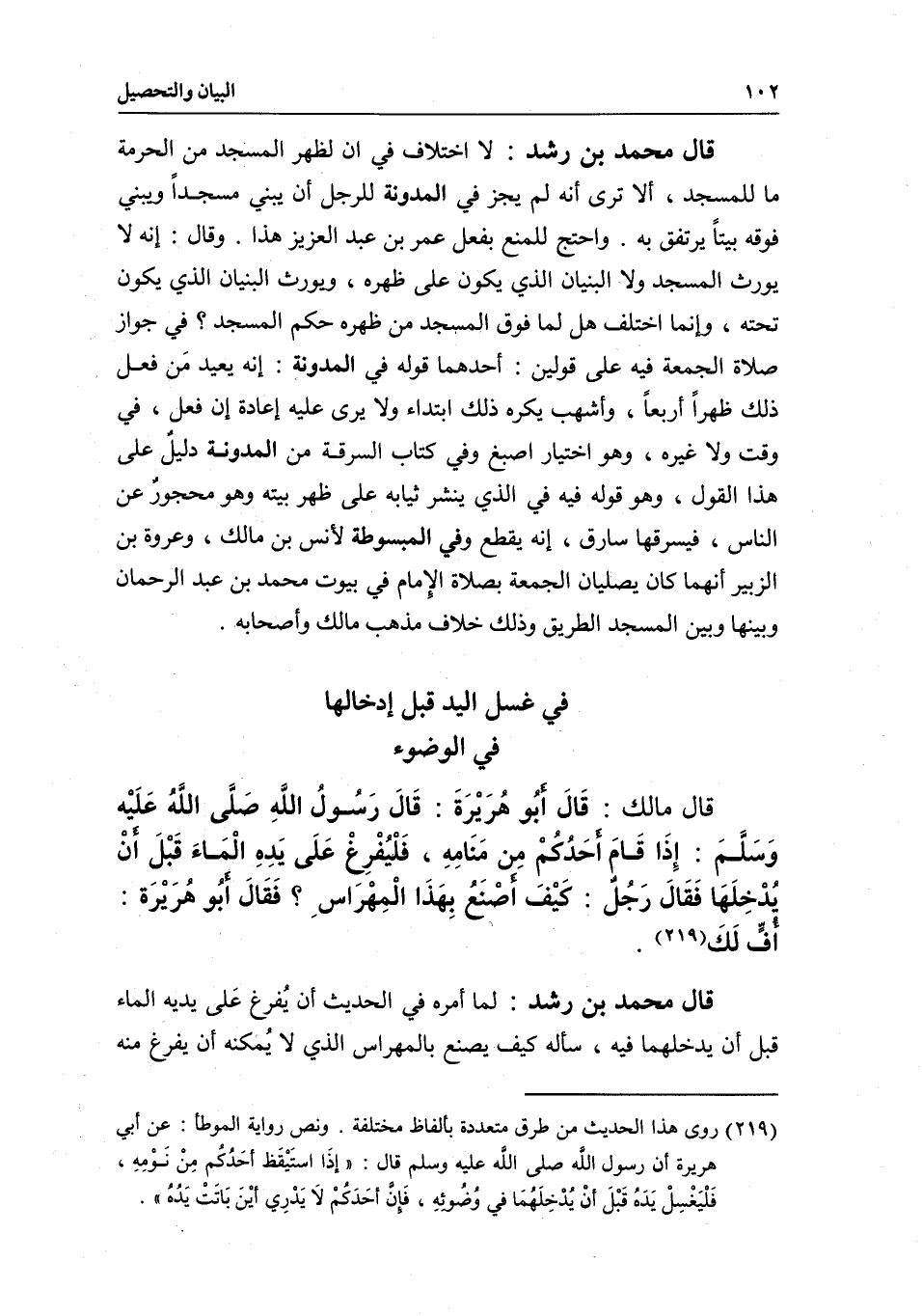 في غسل اليد قبل إدخالها في الوضوء قال مالك: قَالَ أبُو هُرَيْرَةَ: قَالَ رَسُولُ اللَّهِ - صَلَّى اللَّهُ عَلَيْهِ وَسَلَّمَ -: «إِذَا قَامَ أحَدُكُمْ مِن مَنَامِهِ، فَلْيُفْرِغْ عَلَى يَدِهِ الْمَاءَ قَبْلَ أنْ يُدْخِلَهَا" فَقَالَ رَجُلٌ: كَيْفَ أصْنَعُ بِهَذَا الْمِهْرَاس؟ فَقَالَ أبُو هُرَيرَة: أفٍّ لَكَ» .