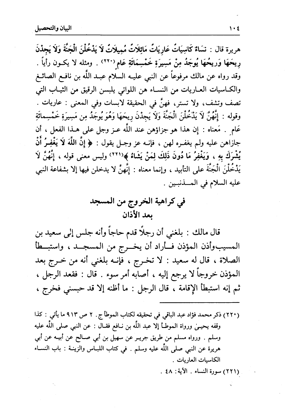 هريرة قال: «نسَاءٌ كَاسِيَاتٌ عَارِيَاتٌ مَائِلَاتٌ مُمِيلاَت لَا يَدْخُلْنَ الْجَنَّةَ وَلَا يَجِدْنَ رِيحَهَا وَريحُهَا يُوجَدُ مِنْ مَسِيرَةِ خَمْسِمَائَةِ عَامٍ» . ومثله لا يكون رأياً. وقد رواه عن مالك مرفوعاً عن النبي - عَلَيْهِ السَّلَامُ - عبد اللَّه بن نافع الصائغ. والكاسيات العاريات من النساء هن اللواتي يلبسن الرقيق من الثياب التي تصف وتشف ولا تستر، فهنَّ في الحقيقة لابسات، وفي المعنى: عاريات.