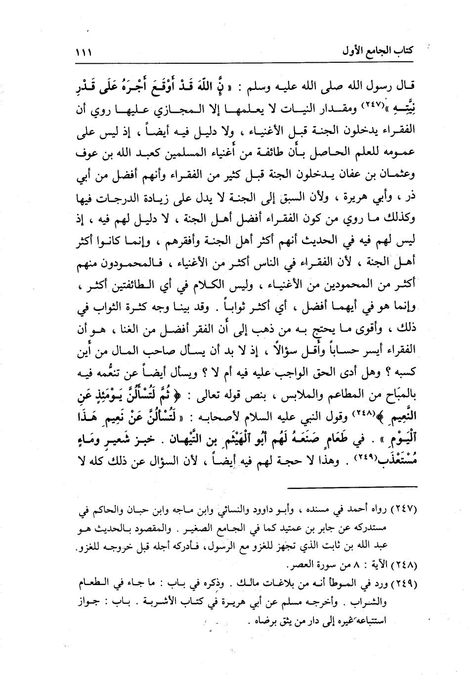 قال رسول الله - صَلَّى اللَّهُ عَلَيْهِ وَسَلَّمَ -: «إن اللهَ قَدْ أوْقَعَ أجْرَهُ عَلَى قَدْرِ نيَّتِهِ» ، ومقدار النيات لا يعلمها إلا المجازي عليها. روي: أن الفقراء يدخلون الجنة قبل الأغنياء. ولا دليل فيه أيضاً، إذ ليس على عمومه؛ للعلم الحاصل بأن طائفة من أغنياء المسلمين كعبد الرحمن بن عوف وعثمان بن عفان يدخلون الجنة قبل كثير من الفقراء وأنهم أفضل من أبي ذر، وأبي هريرة، ولأن السبق إلى الجنة لا يدل على زيادة الدرجات فيها، وكذلك ما روي من كون "الفقراء أفضل أهل الجنة" لا دليل لهم فيه، إذ ليس لهم فيه في الحديث أنهم أكثر أهل الجنة وأفقرهم، وإنما كانوا أكثر أهل الجنة؛ لأن الفقراء في الناس أكثر من الأغنياء، فالمحمودون منهم أكثر من المحمودين من الأغنياء، وليس الكلام في أي الطائفتين أكثر، وإنما هو في أيهما أفضل، أي: أكثر ثواباً.