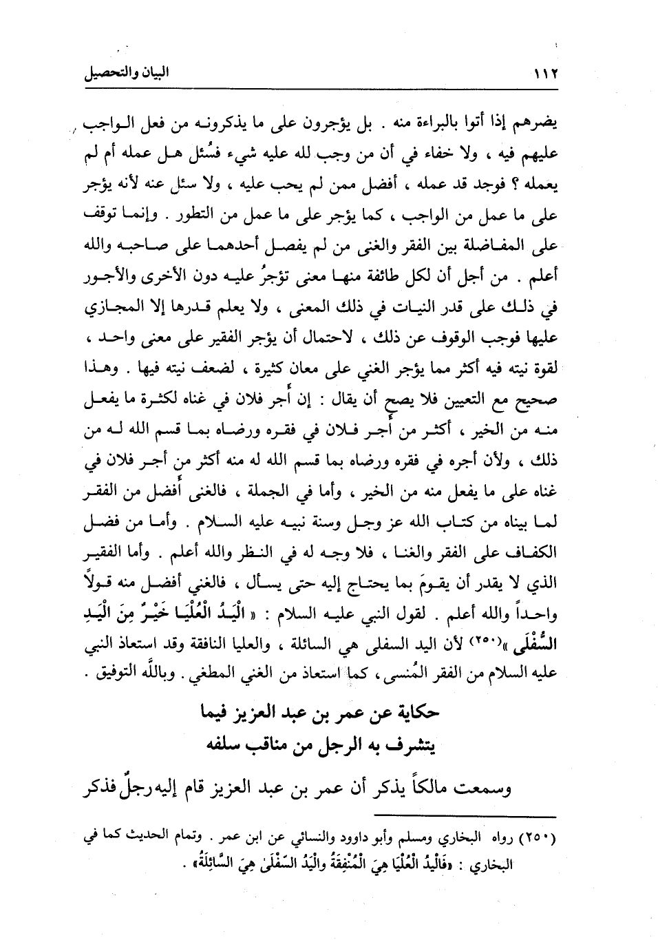 وأما في الجملة فالغنى أفضل من الفقر لما بيناه من كتاب الله عز وجل وسنة نبيه - عَلَيْهِ السَّلَامُ -. وأما من فضل الكفاف على الفقر والغنى، فلا وجه له في النظر والله أعلم. وأما الفقير الذي لا يقدر أن يقومَ بما يحتاج إليه حتى يسأل، فالغني أفضل منه قولاً واحداً، والله أعلم؛ لقول النبي - عَلَيْهِ السَّلَامُ -: «الْيَدُ الْعُلْيَا خَيْرٌ مِنَ الْيَدِ السًّفْلَى» ؛ لأن اليد السفلى هي السائلة، والعليا النافقة، وقد استعاذ النبي - عَلَيْهِ السَّلَامُ - من الفقر المُنسى، كما استعاذ من الغني المطغي. وباللَّه التوفيق.