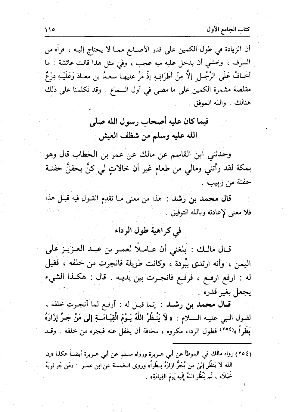 قال مالك: بلغني أن عاملًا لعمر بن عبد العزيز على اليمن، وأنه ارتدى ببُردة، وكانت طويلة فانجرت من خلفه، فقيل له: ارفع ارفع، فرفع فانجرت بين يديه. قال: هكذا الشيء يجعل بغير قدره.