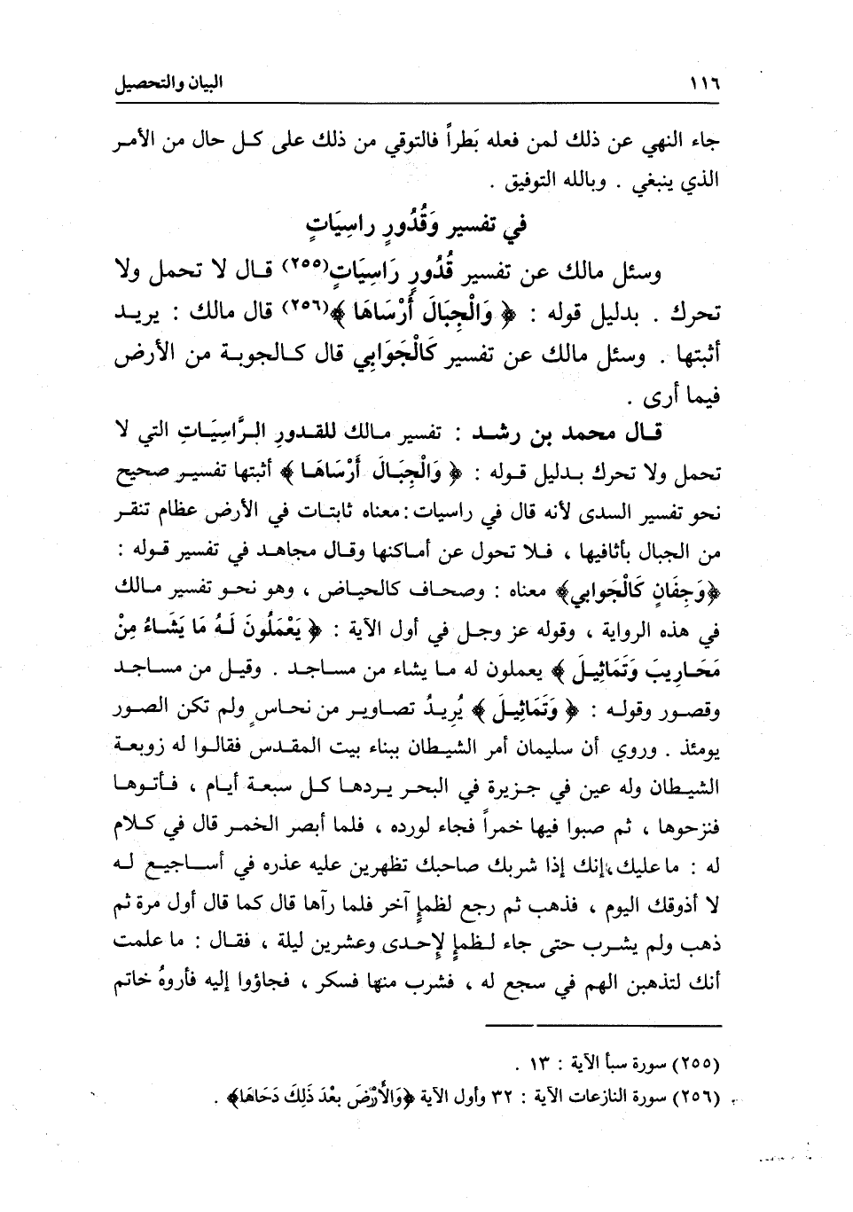 قال محمد بن رشد: تفسير مالك للقدورِ الَرّاسِيَاتِ التي لا تحمل ولا تحرك بدليل قوله: {وَالْجِبَالَ أَرْسَاهَا} [النازعات: 32] أثبتها تفسير صحيح نحو تفسير السدي؛ لأنه قال فيِ {رَاسِيَاتٍ} [سبأ: 13] : معناه ثابتات في الأرض، عظام تنقر من الجبال بأثافيها، فلا تحول عن أماكنها. وقال مجاهد في تفسير قوله: {وَجِفَانٍ كَالْجَوَابِ} [سبأ: 13] معناه: وصحاف كالحياض، وهو نحو تفسير مالك في هذه الرواية، وقوله عز وجل في أول الآية: {يَعْمَلُونَ لَهُ مَا يَشَاءُ مِنْ مَحَارِيبَ وَتَمَاثِيلَ} [سبأ: 13] ، يعملون له ما يشاء من مساجد. وقيل: من مساجد وقصور.