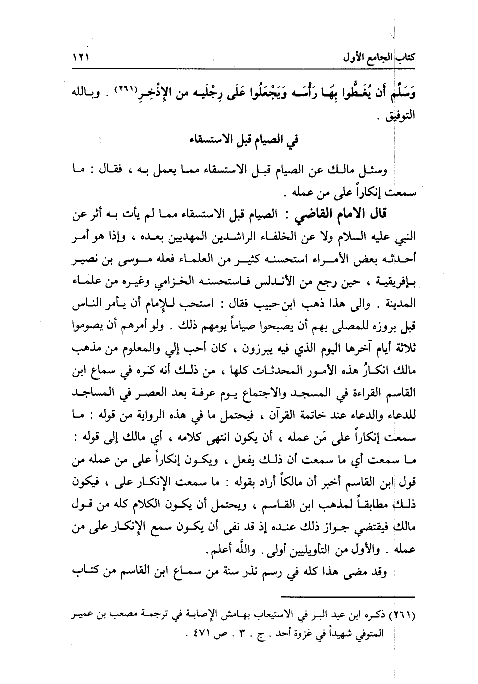 قال الإمام القاضي: الصيام قبل الاستسقاء مما لم يأت به أثر عن النبي - عَلَيْهِ السَّلَامُ - ولا عن الخلفاء الراشدين المهديين بعده، وإذا هو أمر أحدثه بعض الأمراء استحسنه كثير من العلماء، فعله موسى بن نصير بإفريقية، حين رجع من الأندلس فاستحسنه الخزامي وغيره من علماء المدينة.