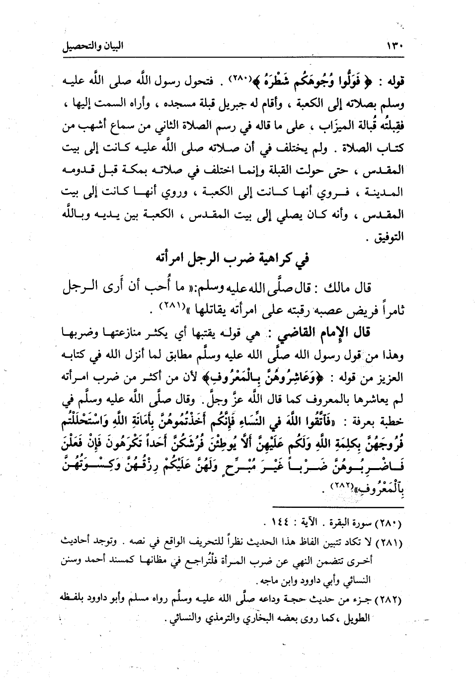 قوله: {فَوَلُّوا وُجُوهَكُمْ شَطْرَهُ} [البقرة: 144] . فتحول رسول اللَّه - صَلَّى اللَّهُ عَلَيْهِ وَسَلَّمَ - بصلاته إلى الكعبة، وأقام له جبريل قبلة مسجده، وأراه السمت إليها، فقِبلتُه قُبالة الميزَاب، على ما قاله في رسم الصلاة الثاني من سماع أشهب من كتاب الصلاة. ولم يختلف في أن صلاته صَلَّى اللَّهُ عَلَيْهِ كانت إلى بيت المقدس، حتى حولت القبلة وإنما اختلف في صلاته بمكة قبل قدومه المدينة، فروي أنها كانت إلى الكعبة، وروي أنها كانت إلى بيت المقدس، وأنه كان يصلي إلى بيت المقدس، الكعبة بين يديه وباللَّه التوفيق.