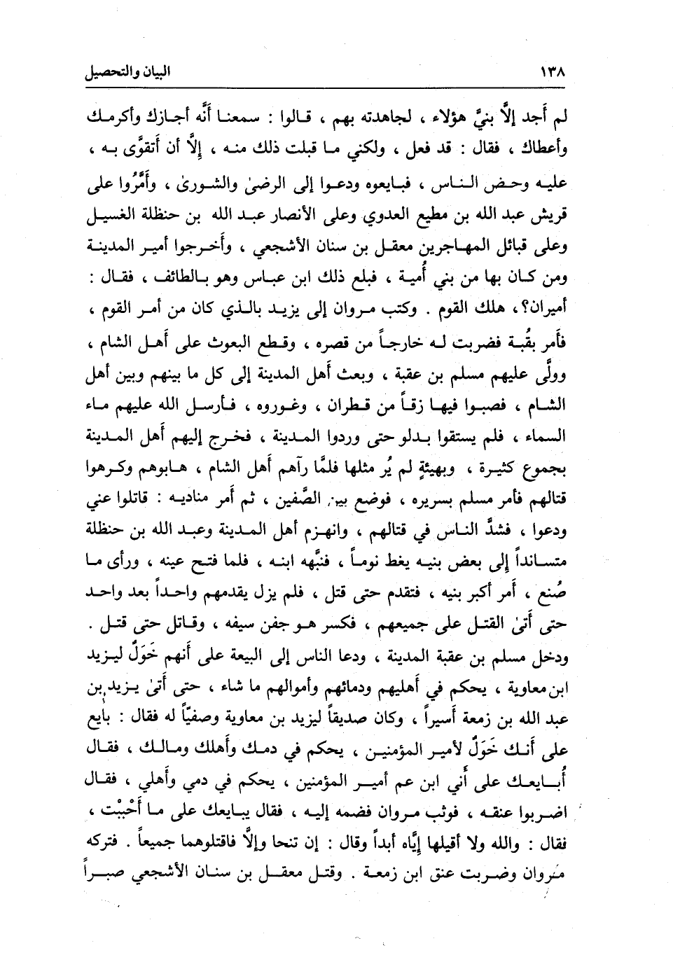 لم أَجد إلاَّ بنيَّ هؤلاء، لجاهدته بهم، قالوا: سمعنا أَنَّه أجازك وأكرمك وأعطاك، فقال: قد فعل، ولكني ما قبلت ذلك منه، إِلّاَ أن أتقوَى به عليه، وحض الناس فبايعوه، ودعوا إلى الرضى والشورى، وأَمَّرُوا على قريش عبد الله بن مطيع العدوي وعلى الأنصار عبد الله بن حنظلة الغسيل وعلى قبائل المهاجرين معقل بن سنان الأشجعي، وأَخرجوا أمير المدينة ومن كان بها من بني أُمية، فبلع ذلك ابن عباس وهو بالطائف، فقال: أميران؟، هلك القوم. وكتب مروان إلى يزيد بالذي كان من أمر القوم، فأَمر بقُبة فضربت له خارجاً من قصره، وقطع البعوث على أَهل الشام، وولَّى عليهم مسلم بن عقبة، وبعث أَهل المدينة إلى كل ماء بينهم وبين أهل الشام، فصبوا فيها زقاً من قطران، وغوروه، فأرسل الله عليهم ماء السماء، فلم يستقوا بدلو حتى وردوا المدينة، فخرج إليهم أَهل المدينة بجموع كثيرة، وبهيئةٍ لم يُر مثلها فلمَّا رآهم أَهل الشام، هابوهم وكرهوا قتالهم فأمر مسلم بسريره، فوضع بين الصَّفين، ثم أَمر مناديه: قاتلوا عني ودعوا، فشدَّ الناس في قتالهم، وانهزم أهل المدينة وعبد الله بن حنظلة متسانداً إِلى بعض بنيه يغط نوماً، فنبَّهه ابنه، فلما فتح عينه، ورأى ما صًنع، أَمر أكبر بنيه، فتقدم حتى قتل، فلم يزل يقدمهم واحداً بعد واحد حتى أَتى القتل على جميعهم، فكسر هو جفن سيفه، وقاتل حتى قتل. ودخل مسلم بن عقبة المدينة، ودعا الناس إلى البيعة على أَنهم خَوَلٌ ليزيد ابن معاوية، يحكم في أَهليهم ودمائهم وأموالهم ما شاء، حتى أَتى يزيد بن عبد الله بن زمعة أَسيراً، وكان صديقاً ليزيد بن معاوية وصفيّاً له فقال: بايع على أَنك خَوَلٌ لأمير المؤمنين، يحكم في دمك وأَهلك ومالك، فقال أُبايعك على أني ابن عم أمير المؤمنين، يحكم في دمي وأَهلي، فقال: اضربوا عنقه، فوثب مروان فضمه إليه، فقال: يبايعك على ما أَحببت، فقال: والله ولا أقيلها إِيَّاه أبداً وقال: إن تنحا وإلّاَ فاقتلوهما جميعا. فتركه مروان وضربت عنق ابن زمعة. وقتل معقل بن سنان الأشجعي صبرا